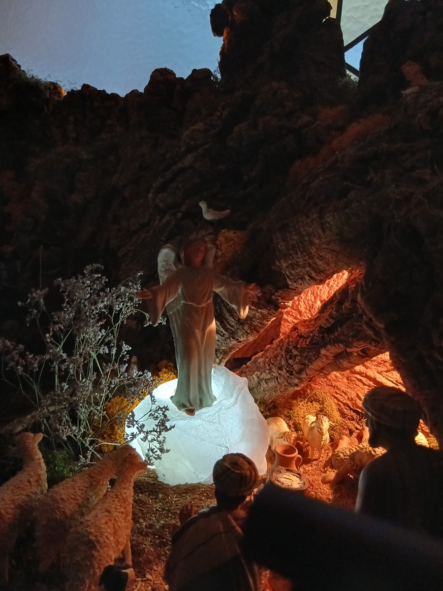 Mi belén a la caída tarde. La escasa luz que que traspasa la vidriera toca las figuras, el corcho, el musgo, el serrín, la vegetación... produce un juego de luces y sombras que atrae a quien lo contempla.
