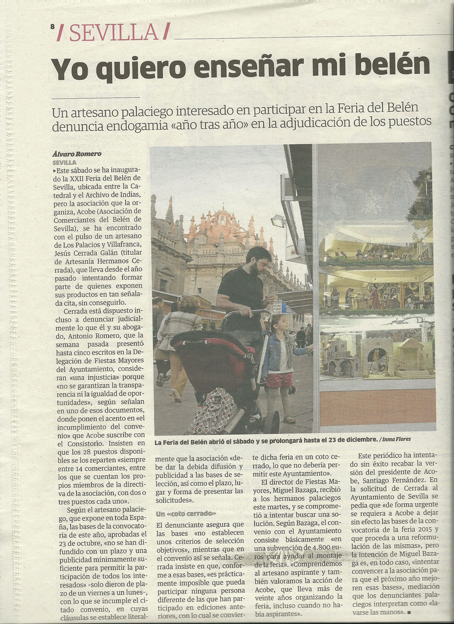 Decir que la feria empezó hace 22 años con tan sólo 3 expositores, y que año tras año se han ido incorporando nuevos expositores hasta el total de 14 que son actualmente, teniendo en cuanta la limitación de espacio que tenemos ya que se realiza en el casco histórico de la ciudad, hecho este que le da una característica muy especial a la feria. Que incluso en los primeros años nadie apostaba por la Feria del belén de Sevilla y tuvimos que buscar y convencer a compañeros y artesanos para que participaran y hacerla más grande y poco a poco y con mucho esfuerzo hemos conseguido que Sevilla sea la ciudad más surtida en productos para el montaje de Belén. Por lo tanto su afirmación de que Nunca dejaremos entrar a nadie no sólo carece de fundamente sino que no se ajusta a la verdad como usted bien sabe. En cuanto al tema de la documentación el Sr. Cerrada Galán vuelve a estar muy confundido o no se ha leído las bases que el mismo ha aceptado al presentar la solicitud y en la cual se especifican claramente la documentación que hay que aportar y que ha sido revisada y comprobada por la comisión, entendiendo que esta afirmación es producto de la prisa de su escrito en este foro, y no este acusando a la Comisión de selección de falsificar un acta ya que en ese caso tendrá que demostrarlo en los tribunales de justicia de Sevilla.