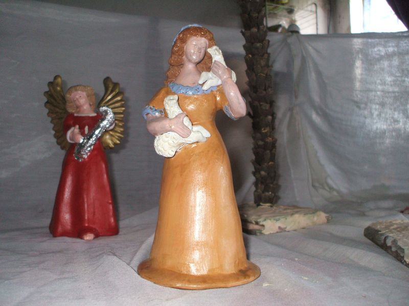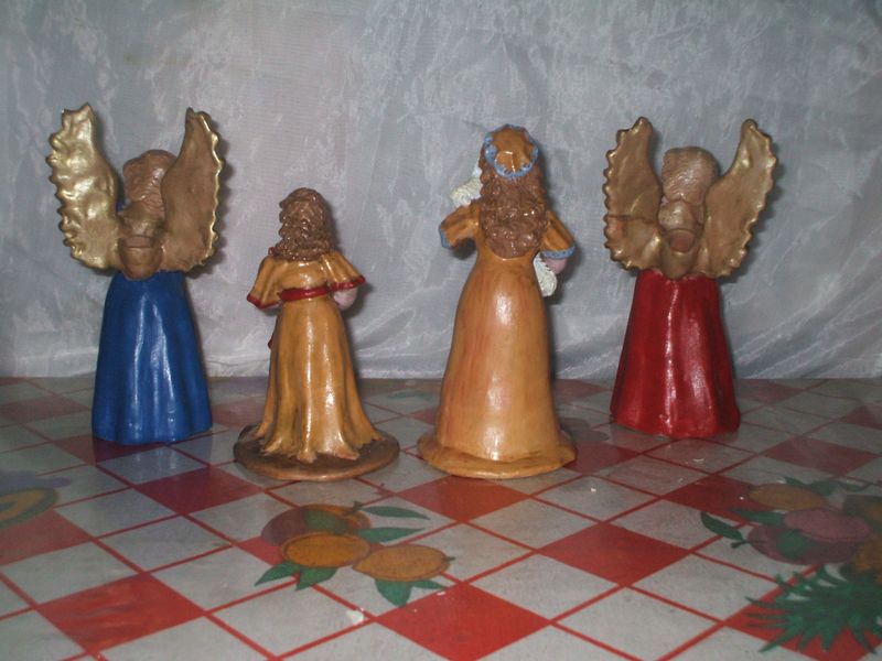 Hola queridos amigos, Compre 4 figuras, de aproximadamente 15 cm,y una oveja 6cm y leendo sobre la pintura Acrilica me intereso, y los pinte, las figuras son de barro...pues aqui les dejo, para que me den sus observaciones, para las otras que voy a comprar, lograr mejor segun sus consejos...esta son para mi belen 2006