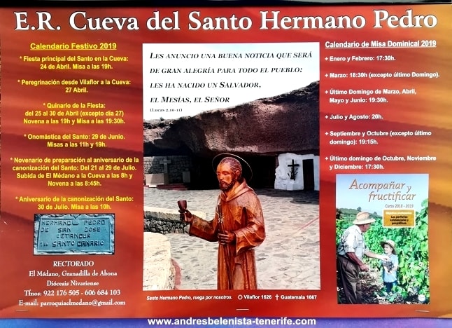 Como son varias las personas, que a través de nuestra Web, nos solicitan cada mes información del Santo, en este Foro les ofrecemos también la siguiente para conocimiento general: en la imagen ven detallada la del Santuario del Hermano Pedro, en la cueva de El Médano, en Tenerife, lugar al que acudía con su rebaño de cabras en la época invernal; su otro lugar de devoción que es donde nació, que es el pueblo de Vilaflor, situado a las faldas del Teide, y que incluye la histórica Iglesia de San Pedro y el templo del Convento Betlemita, están abiertos a diario desde las 9 de la mañana hasta las ocho de la tarde; todos los accesos son gratuitos.