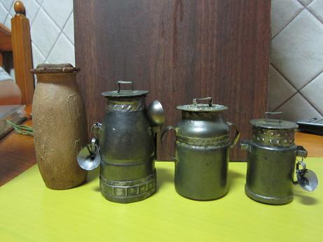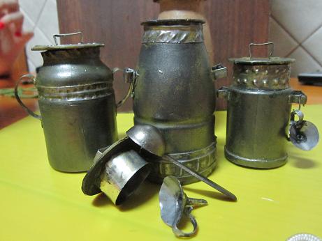 Son escala 1/10 y estan hechas con botes de danacol y otros parecidos de esas bebidas. He pintado los botes con pintura marrón clarita y les he dado con plombargina que es para que parezcan metal y los adornos los he hecho con estaño repujado. Un saludo.