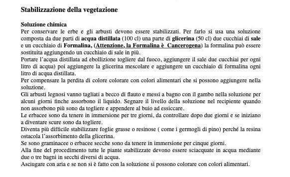 Para conservar hierbas y arbustos hay que estabilizarlos. Para hacerlo se utiliza una disolución compuesta por dos partes de agua destilada (100 cl) una parte de glicerina (50 cl) dos cucharas de sal una cuchara de Formalina (atención, la Formalina es cancerígena); la formalina puede sustituirse añadiendo una cuchara más de sal.