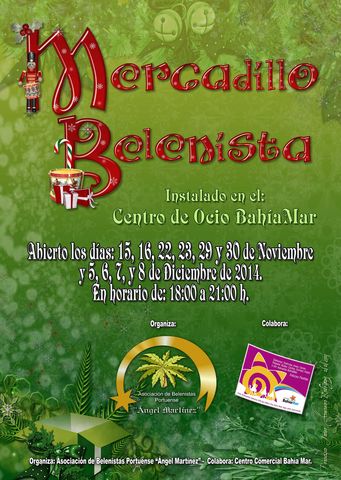 Mercadillo Navideño de la Asociacion de Belenistas Portuense "Angel Martinez" que se instalara como en años anteriores en el centro de Ocio Bahía Mar .Permanecerá abierto al público los días 15,16,22,23,29 y 30 de Noviembre y los días 5,6,7 y 8 de Diciembre en Horario de 18:00 a 21:00 Horas. En este mercadillo se puede encontrar todo lo relacionado con el mundo del belén, luces, figuras, miniaturas, alfarería, revistas , además de Montajes ya realizados por miembros de la asociación