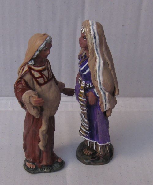 No las he terminado todavía, estoy atascada. Tengo que retocar el manto de la Virgen no me gusta el color, lo voy a poner más claro. La mano de Santa Isabel se la he cogido a un caminante y al caminante le he puesto la de ella, por eso tuve que ponerle mangas anchas para tapar la unión. Esa mano permite dar la sensación de saludo entre las dos. Isabel le dice: mira que barriguita tienes, y luego lo de Bendito sea el fruto...