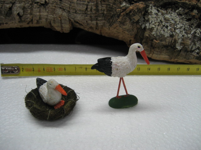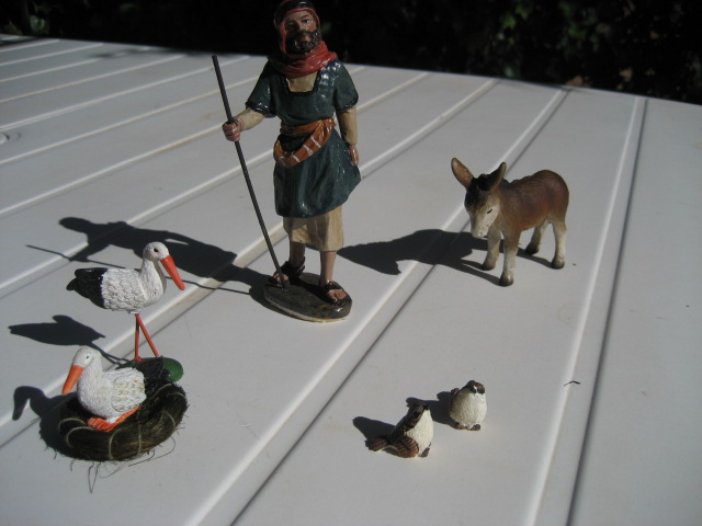 Tienen algunas figuritas de animales y humanos en plástico y resina de la casa Puig y Olivier que merecen la pena.Tanto es así que como muestra compré unos pajaritos y unas cigüeñas que os pongo en unas fotos.También compré en otra tienda, un burrito de la marca Scheiner? que se puede acoplar facilmente.Pongo una figura de la colección de El Prado para que sirva de muestra de tamaño.