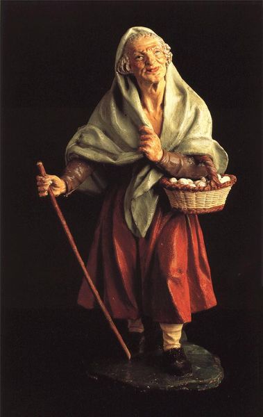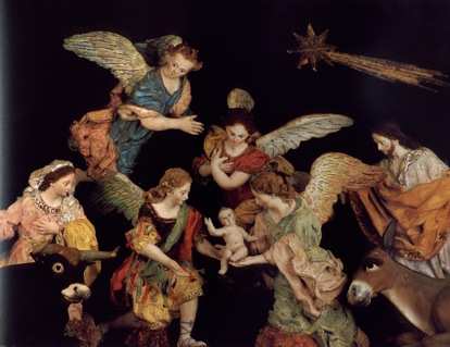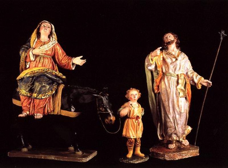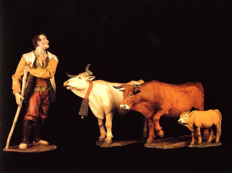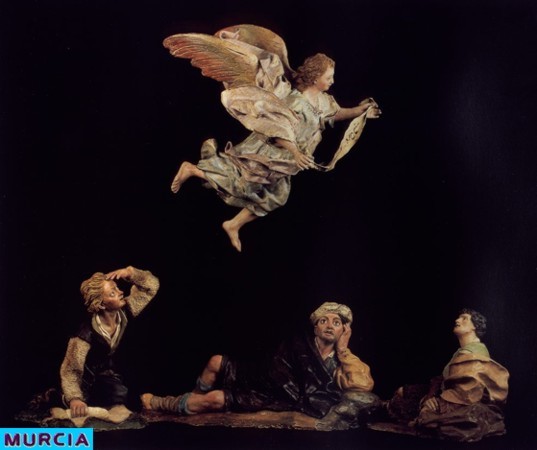En el belén se pueden ver: Pastores de remendadas ropas junto a unos Magos deslumbrantes que se hacen acompañar de pajes vestidos con trajes dieciochescos; Una nutrida guardia de Herodes y los grupos de la degollación de los Inocentes, en las que incluso el gesto y la nobleza de las expresiones delatan rangos militares e incluso sentimientos personales; el pilluelo que, encaramado en una de las columnas del pórtico toscano que le sirve de cobijo, contempla asombrado el Misterio que aparece ante sus ojos; los pastores que organizan su descanso nocturno tras la dura jornada, preparando un fuego que caldee la fría noche y sirva al mismo tiempo para asar carne con la que reponer fuerzas; al vieja que echa de comer a una manada de pavos, y de cuya boca parece brotar ese extraño y gutural sonido que durante siglos ha servido para llamar a las aves de corral quienes, incomprensiblemente, la entienden y acuden a recibir su alimento; el grupo de vacas que pastan bajo la soñolienta mirada del vaquero y en el que el artista a una de ellas lamiéndose mansamente la pata, posiblemente herida por algún espino o picada por un tábano.