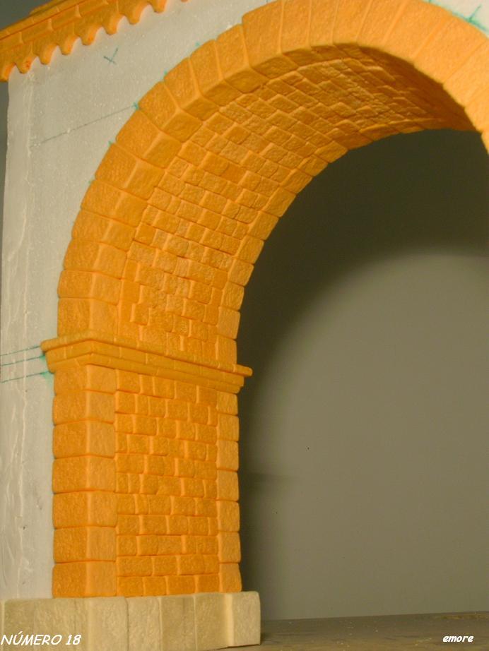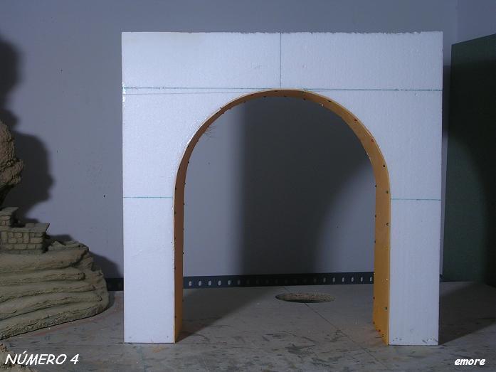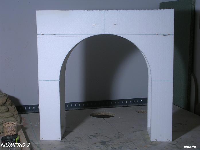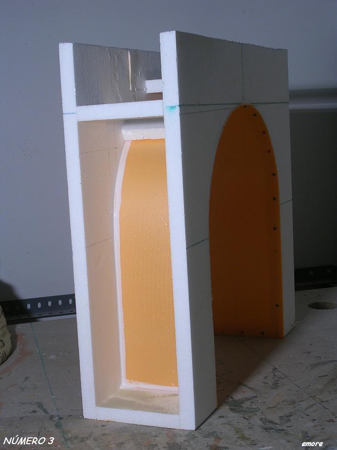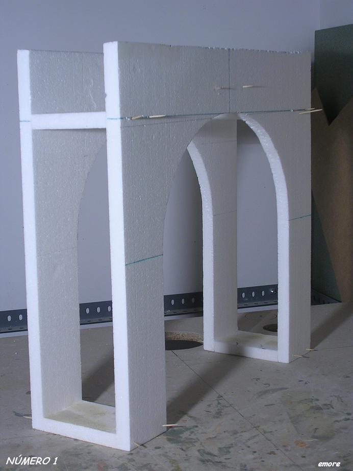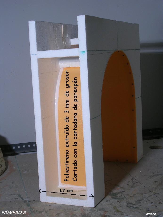 En la cara interna de los dos arcos, he colocado una chapa de poliestireno extruído de 3 mm de grosor y 17 cm de ancha. Dicha chapa la he cortado de una plancha de poliestireno extruído de 3 cm de grosor con la cortadora de porexpán.