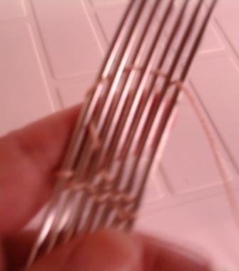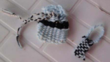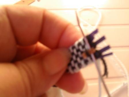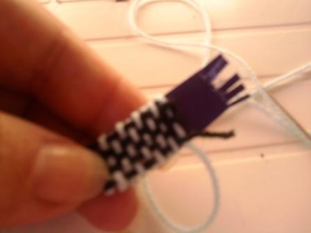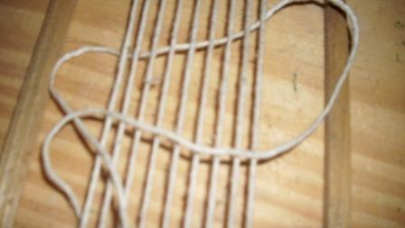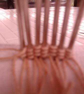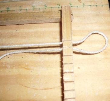para enhebrar trabamos el hilo con un nudo o un lacito en la primer muesca,vamos de abajo hacia arriba y pasamos los hilos como se ve en las fotos, y los tensamos