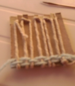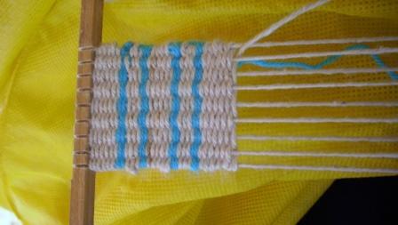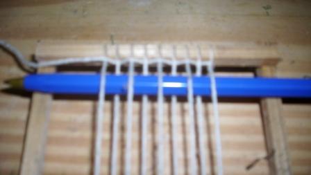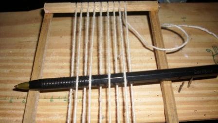 para tejer y para que se note puse una birome, boligrafo, intercalamos los hilos (urdimbres) uno abajo uno arriba uno abajo uno arriba , asi toda la fila .