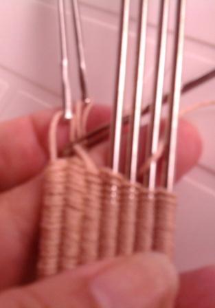 y pasamos el hilo la vuelta va en contrario o sea el que estaba abajo va arriba etc. tejemos en este caso con una sola hebra de ida y de vuelta