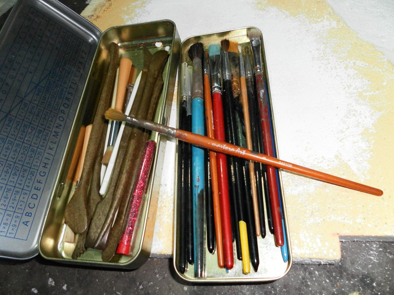 Para envejecer se utilizan tres colore , verde oscur ,verde mas claro y marron oscuro, estas pinturas deven de ser un aguachirri ,osea un poco de pintura y mucha agua.
