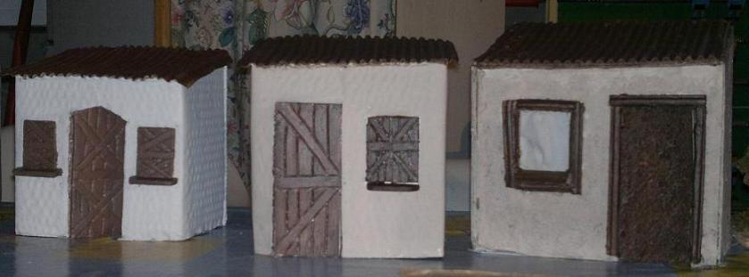 Las casitas (anticrisis) que pongo a continuación las hicimos hace varios años, los ingredientes son:carton, las puertas y ventanas estan hehas con badejas de las que vienen con la carne y las persianas con con palillos, pegamento, hilo, alambre y pintura.