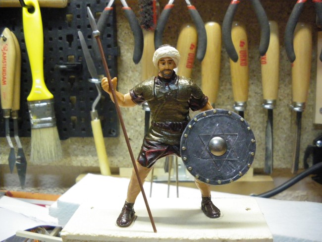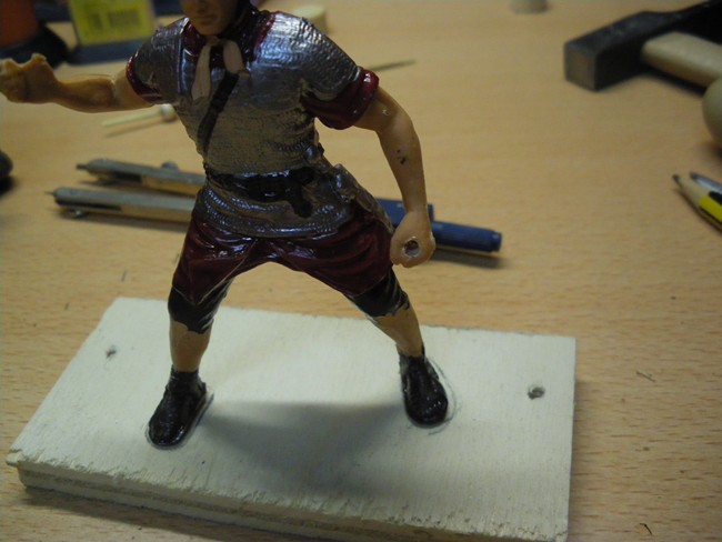 Foto 9- Le pongo el escudo y una lanza de un soldado romano. Le pinto de bronce la cota de malla, y la parte de abajo de marrón castaño. las piernas las retoque con un cutex y las pinte de color