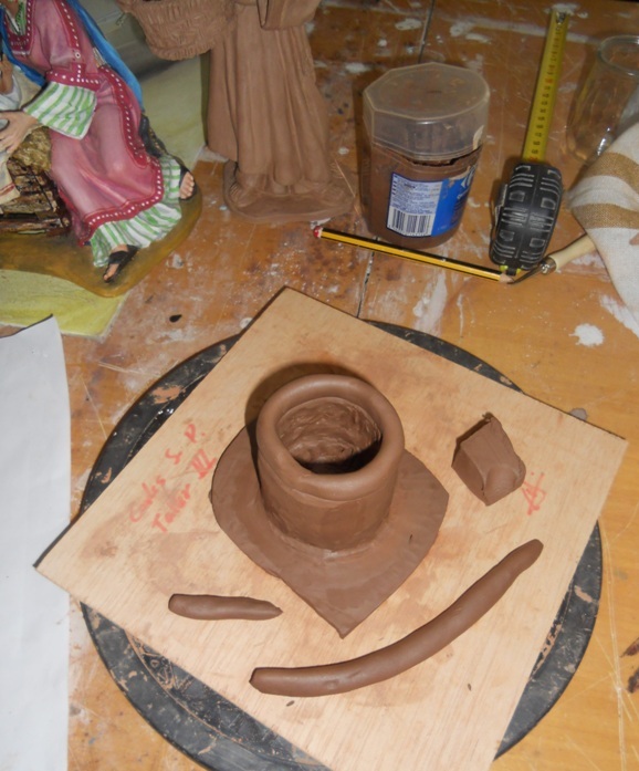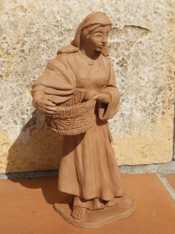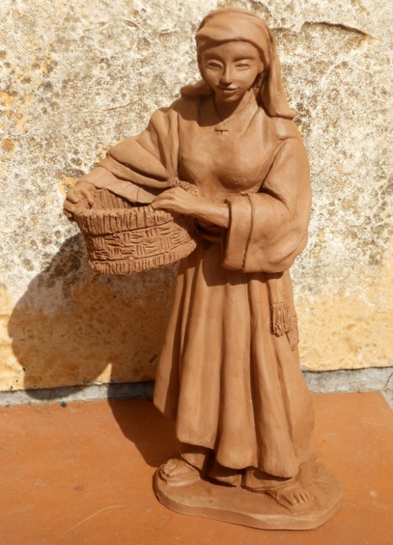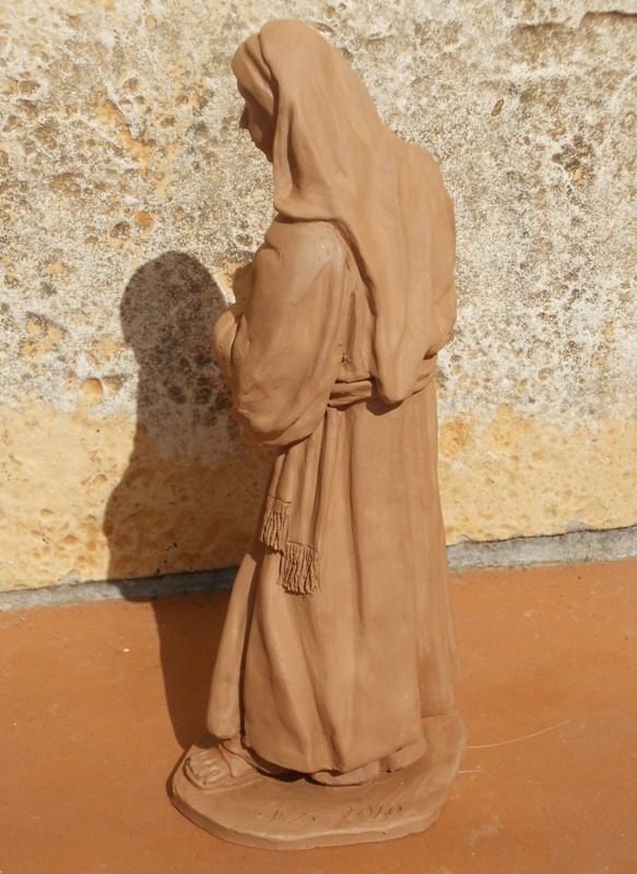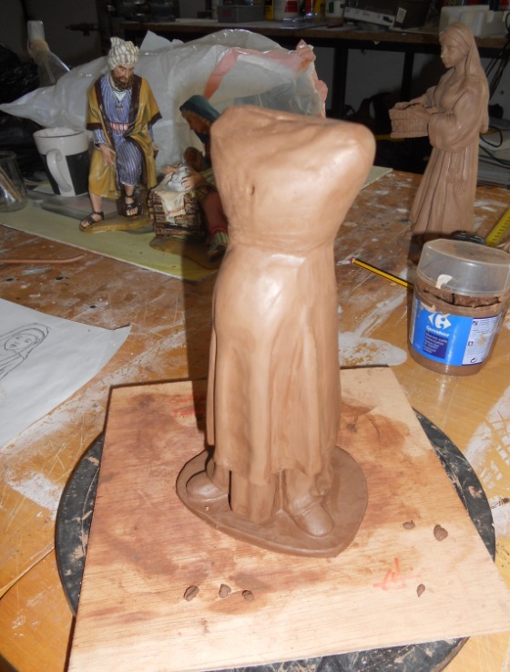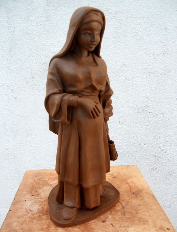 Estos últimos días me he dedicado a intentar el modelado de una figura de 24 cm para mi belén. Se trataba, en principio, de una partera inspirada en una de Mayo, ya que no tenía ninguna figura de ésa clase ( porque mi belén está compuesto de figuras de marmolina o escayola para pintar, y sacan muy pocas pastoras-mujeres). Al final me decidí por hacer la partera pero con la tinaja vacía, para así poder llenarla cada año dependiendo del contexto de la escena donde quiera colocarla.