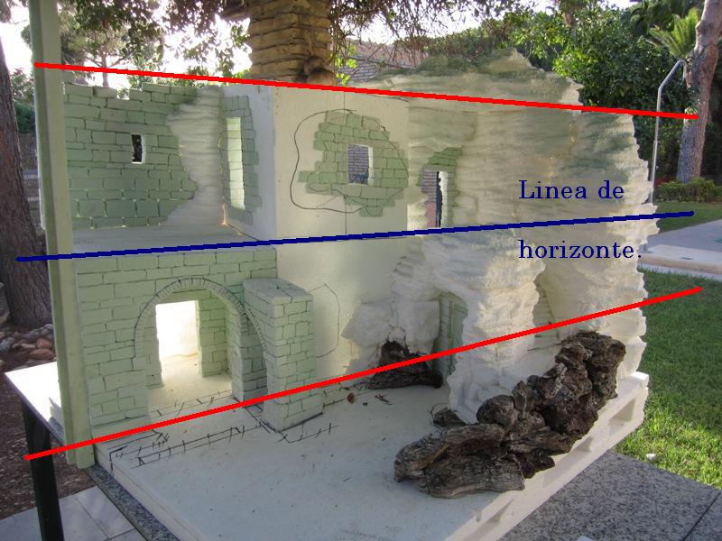 Te adelanto que en grandes belenes o dioramas, se toma como referencia para fijar la línea del horizonte, la altura de los ojos de la persona que lo va a contemplar. Estandarizándose  entre 130 y 150 cm. Hacia allí dirigiremos todas las líneas paralelas. Sobre la línea del horizonte situaremos el punto de fuga. No entro en más profundidad para no liar el tema.