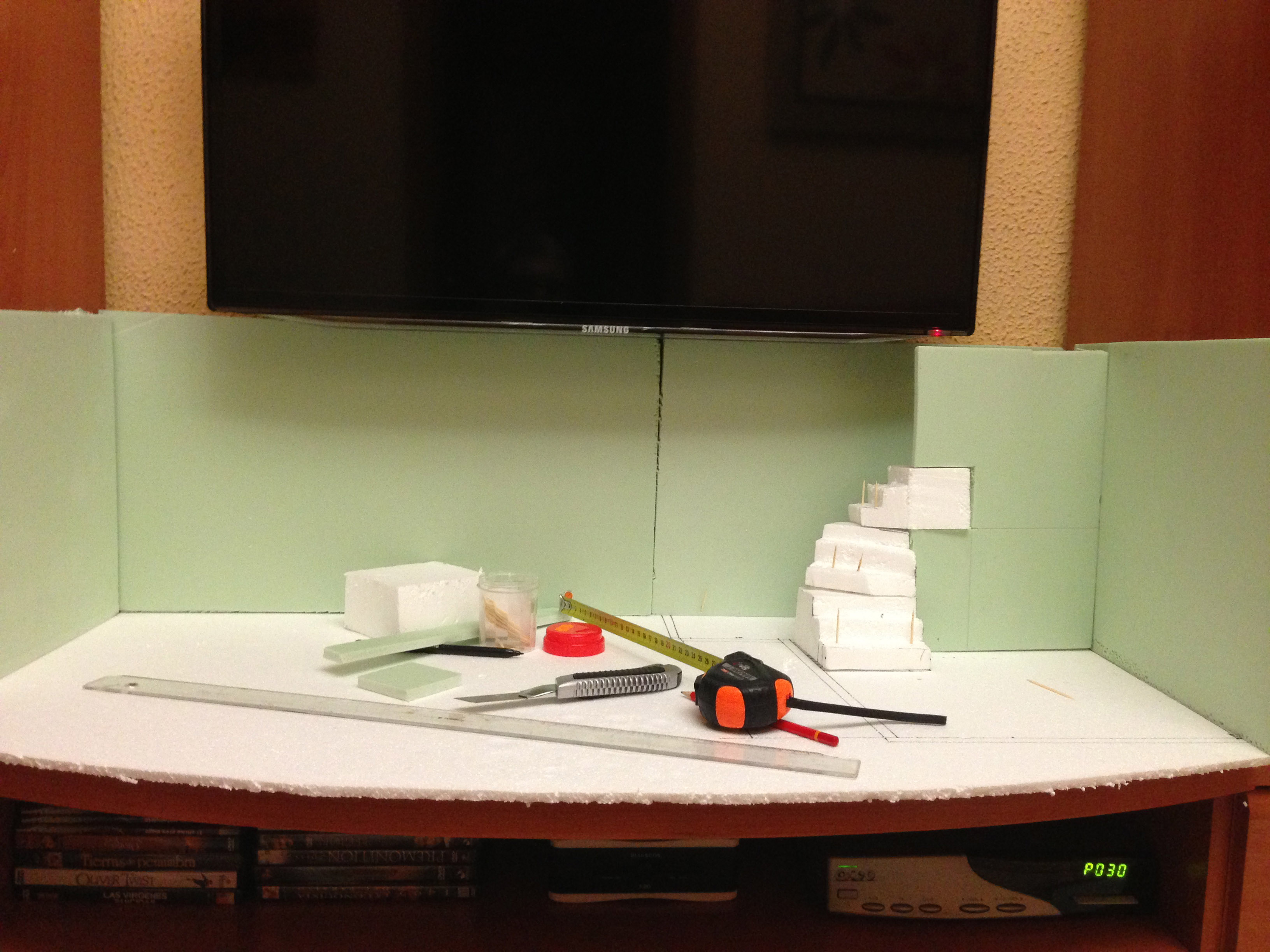Una idea muy buena , me gusta mucho como te está quedando .Pero no va a interferir la luz de la tele con la del belén ?? igual es una tontería , pero la tv proyecta bastante luz...bueno ya nos enseñarás pruebas.