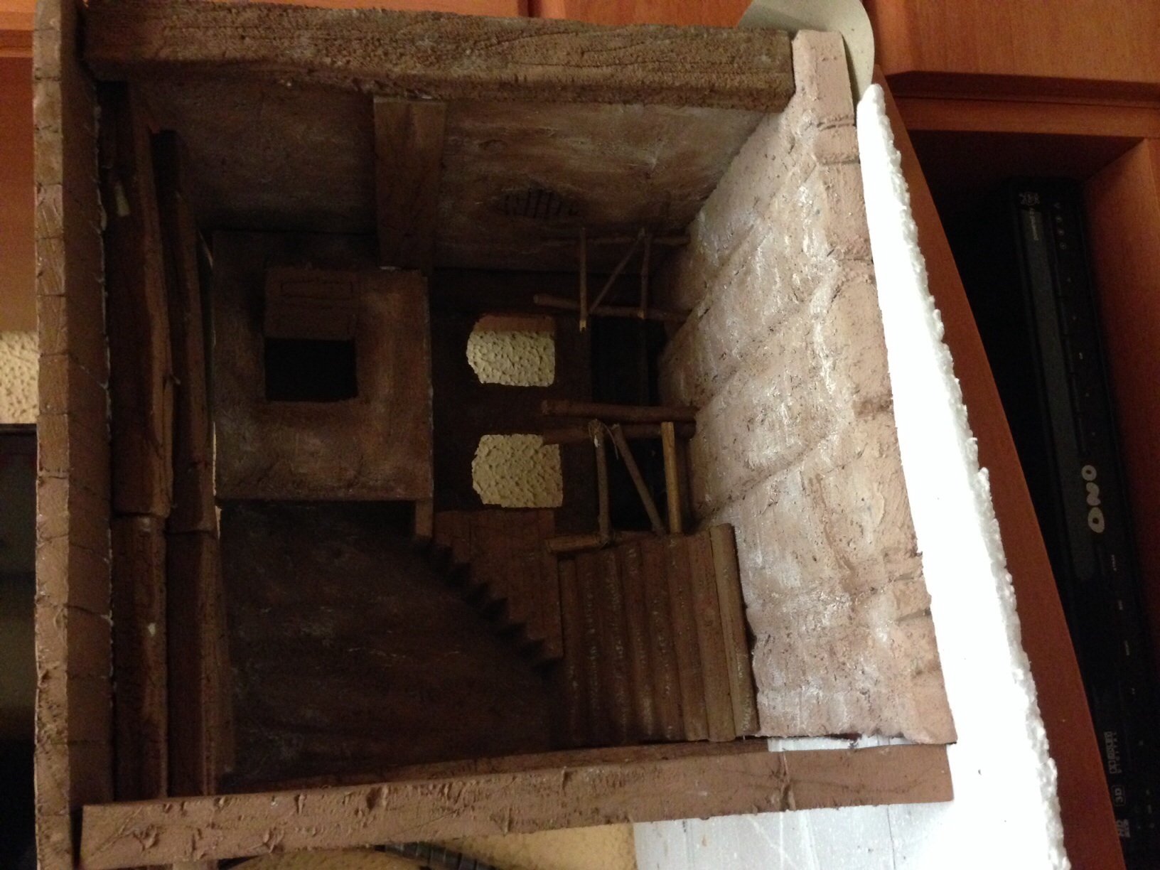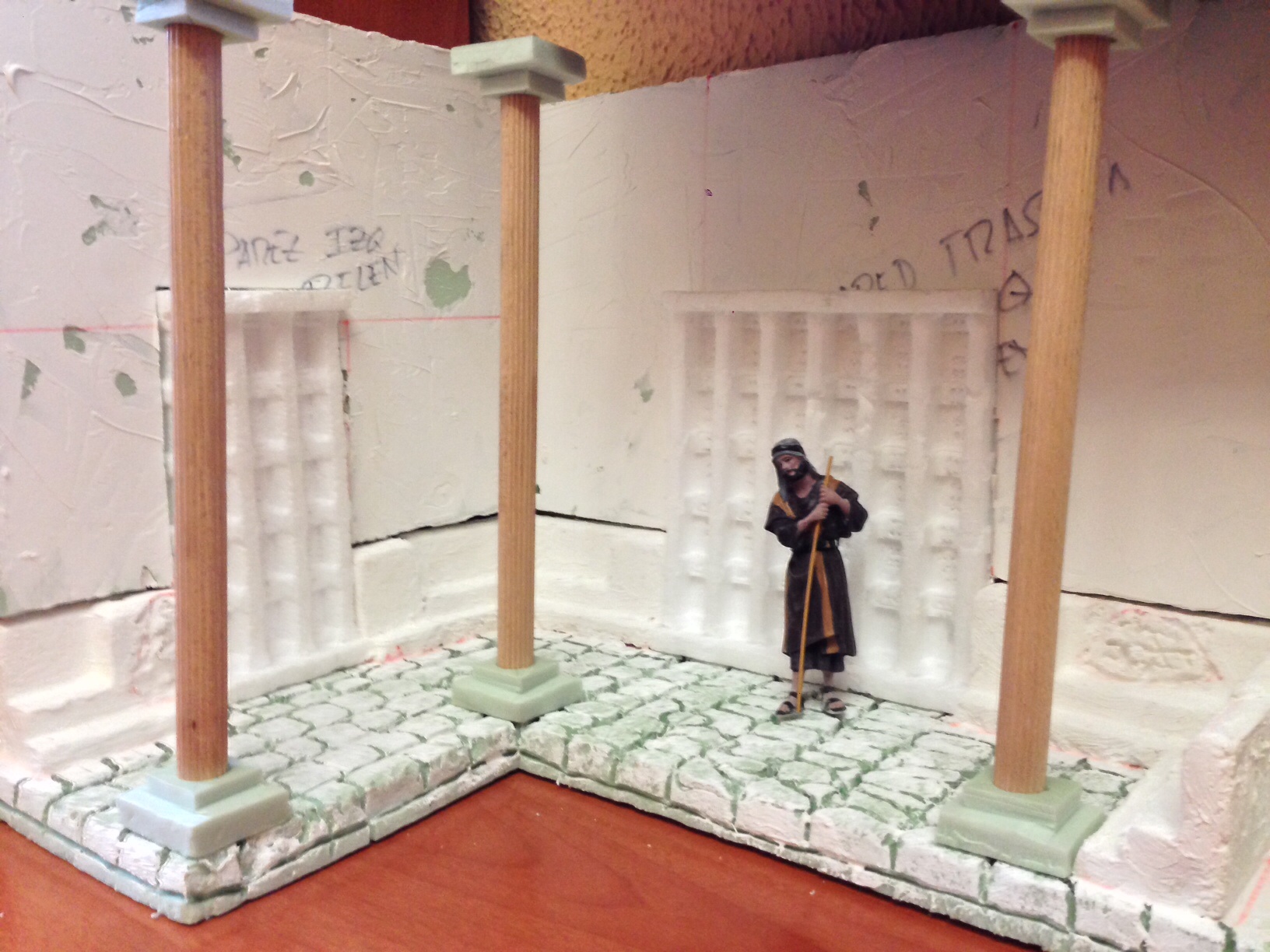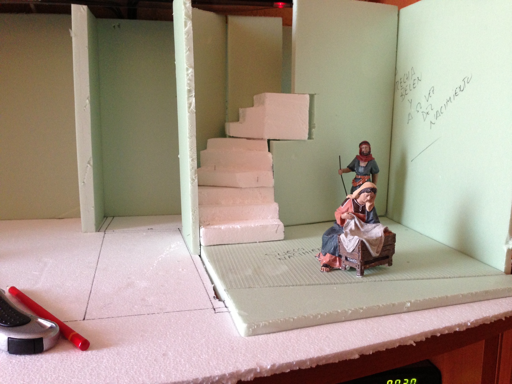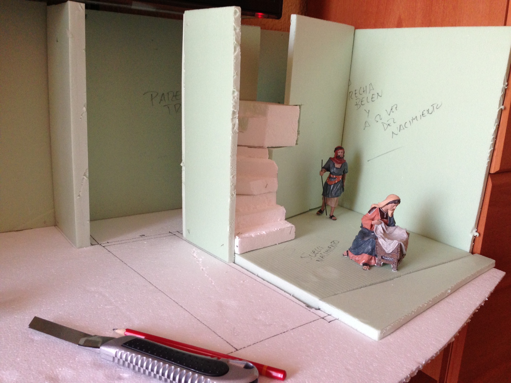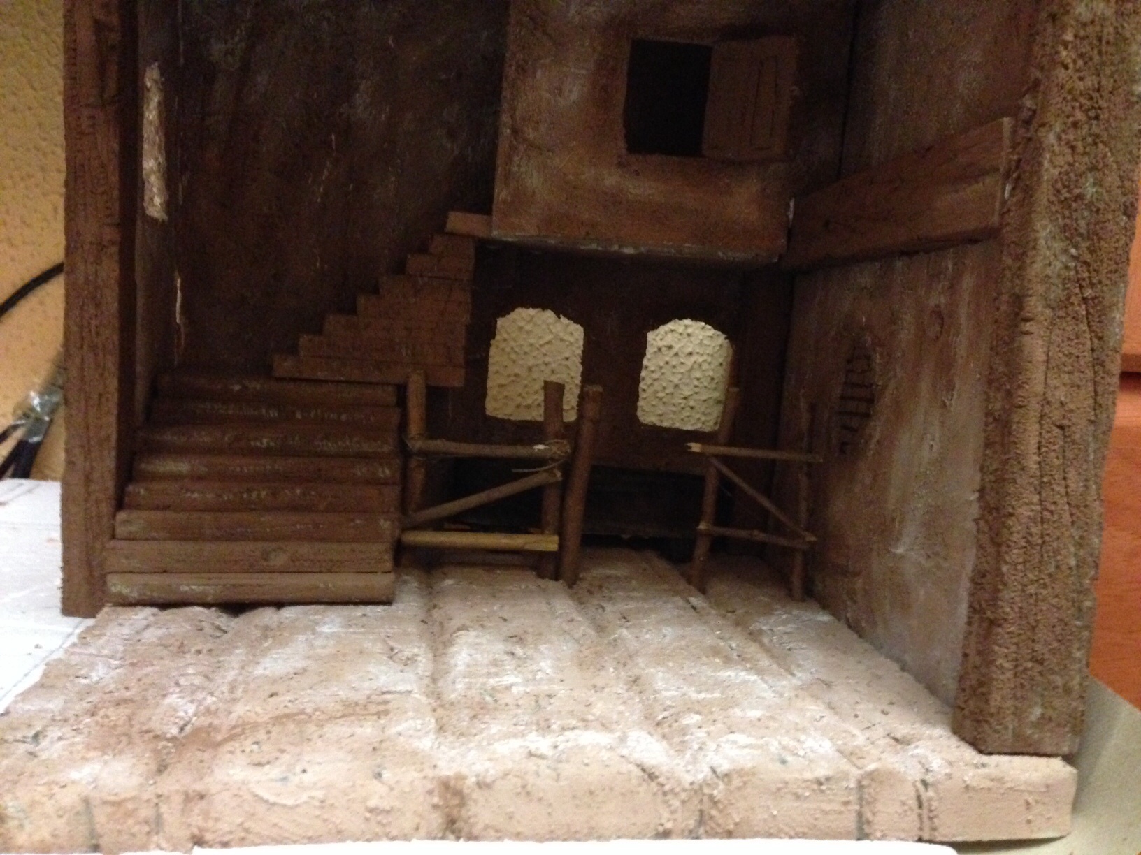 Muchisimas gracias laica, sí serán dos pisos pero solo a la altura que ves en los laterales, al final de la escalera solo se verá una puerta, los peldaños si se ven altos pero una vez ponga el suelo del nacimiento y esculpa esa escalera creo que bajarán esos peldaños o eso espero, jejeje, donde está la figura de pie quisiera abrir un ventanal y poner un paisaje atrás a lo lejos que para eso he dejado a proposito unos 12 cm, aunque esto va a ser difícil, la perspectiva y yo no nos llevamos bien.