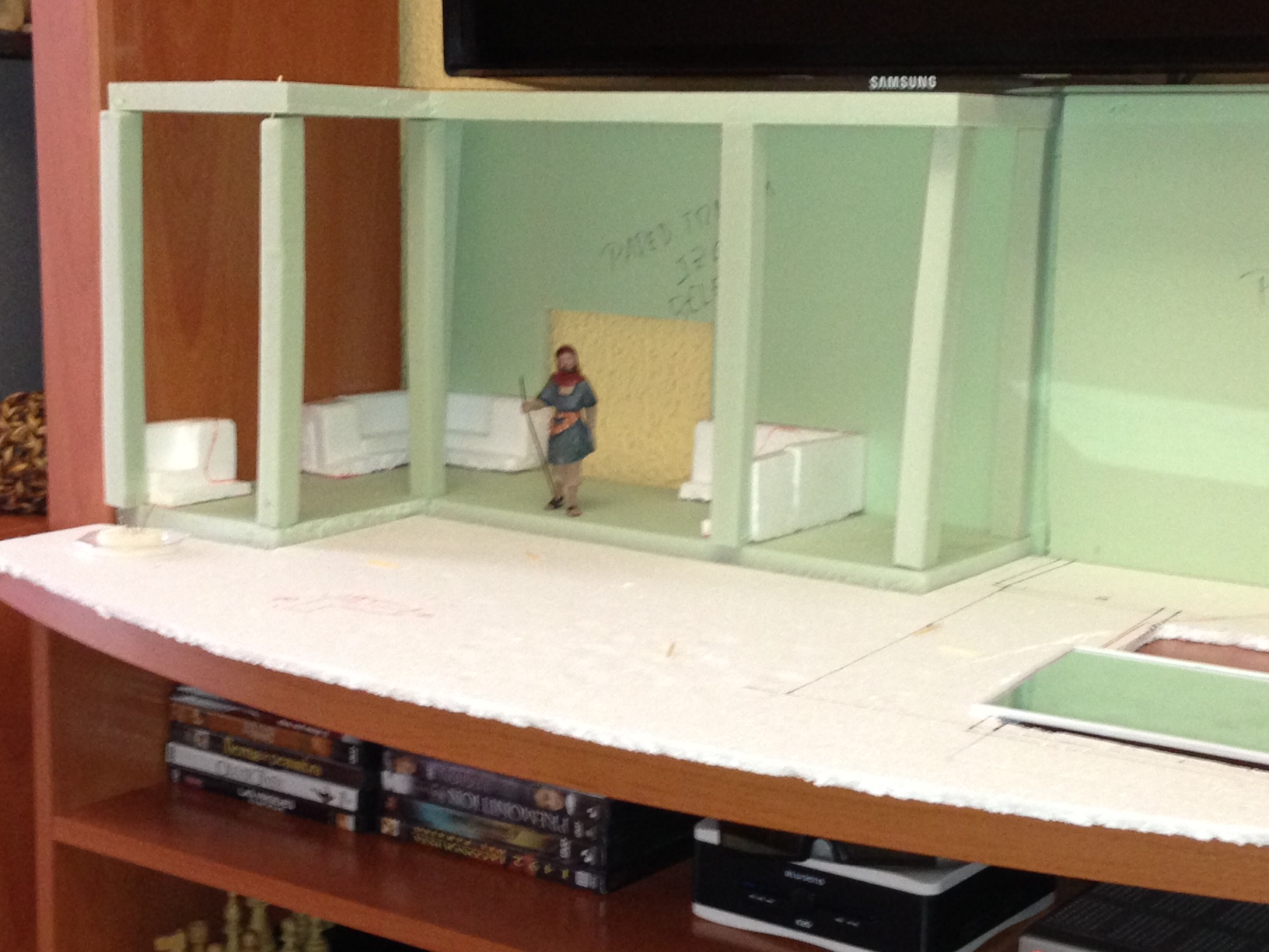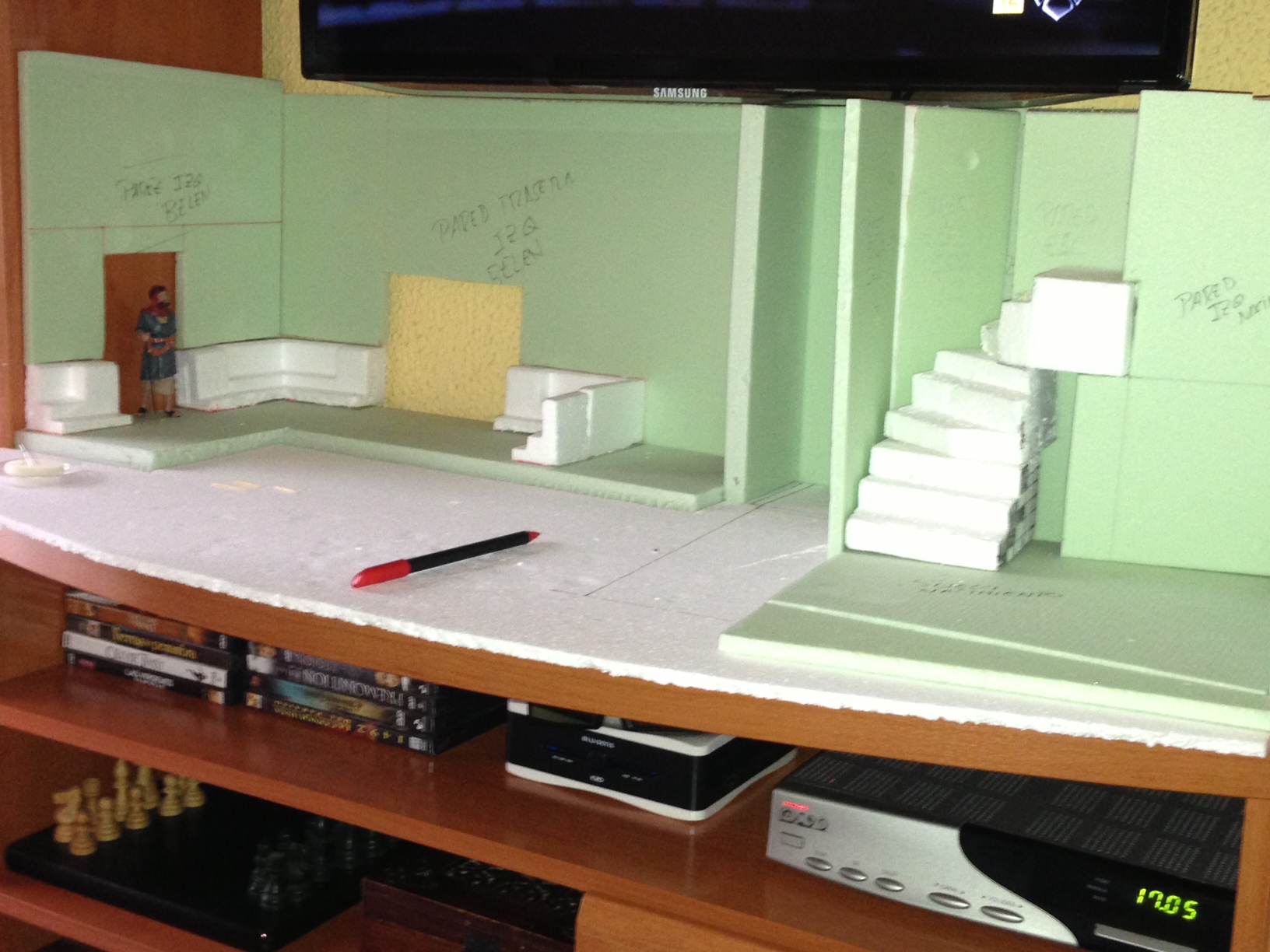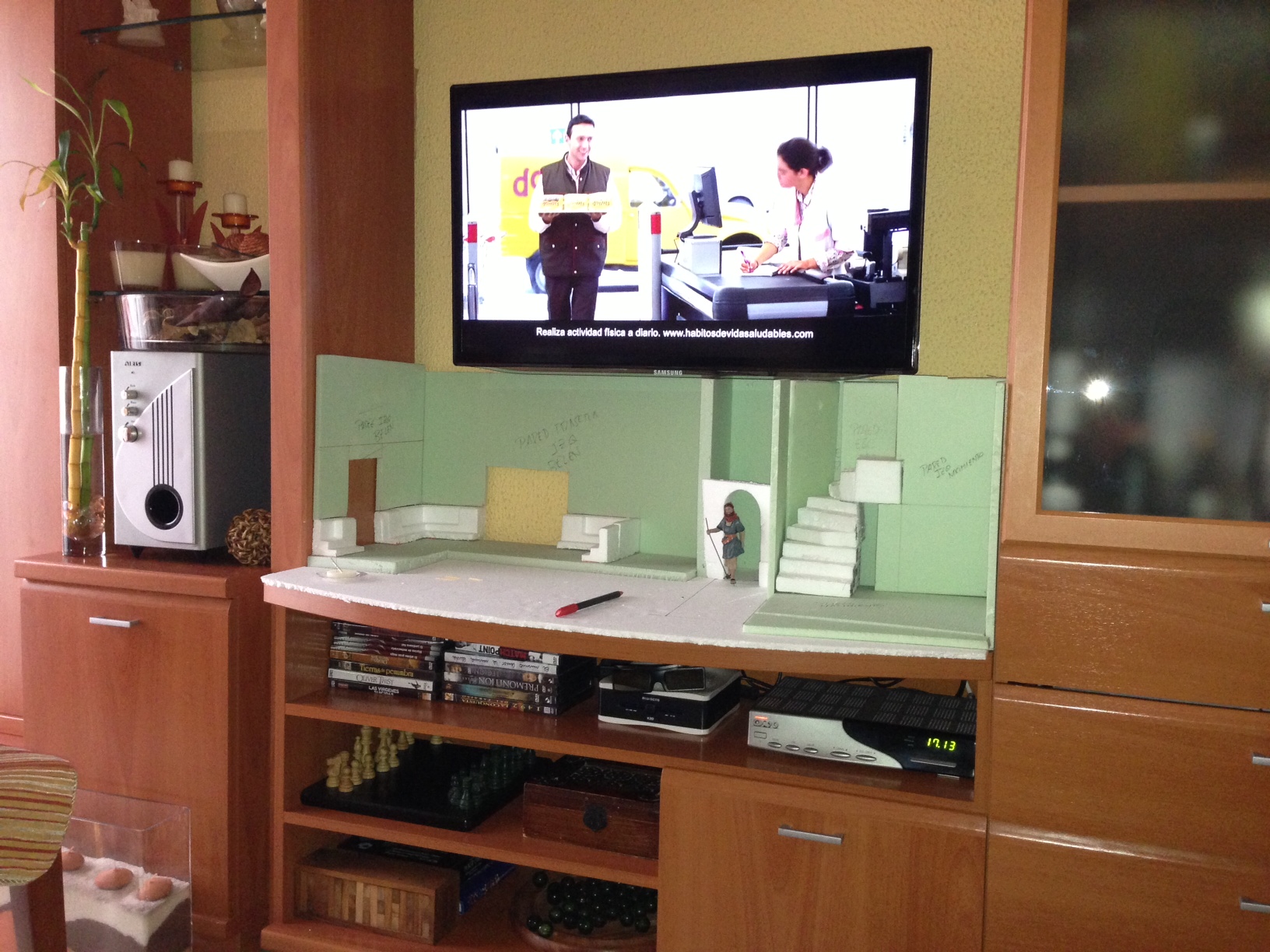 Pues lo dicho en el titulo, en este mueble y con estas medidas he de montar mi belén del 2013, se agradecerian sugerencias antes de empezar, lo que si tengo claro es que no puedo hacer un diorama ya que está a una altura de 60cm del suelo y con una televisión en la pared central encima ( quedaría muy encerrado y feo ).
