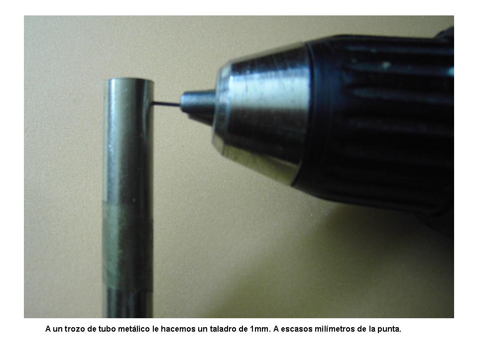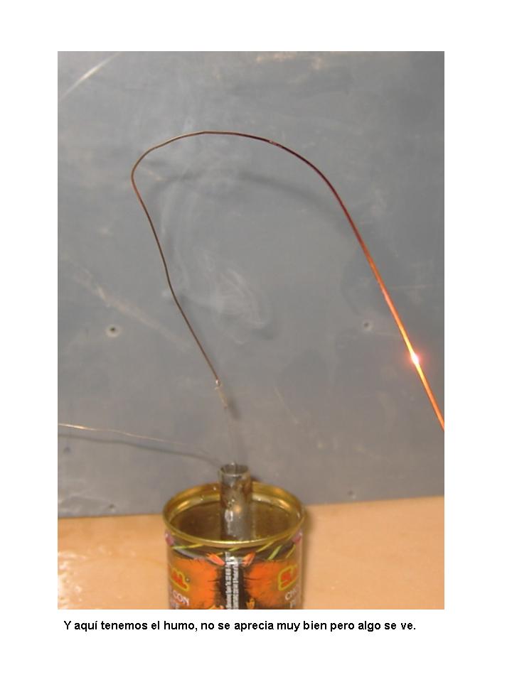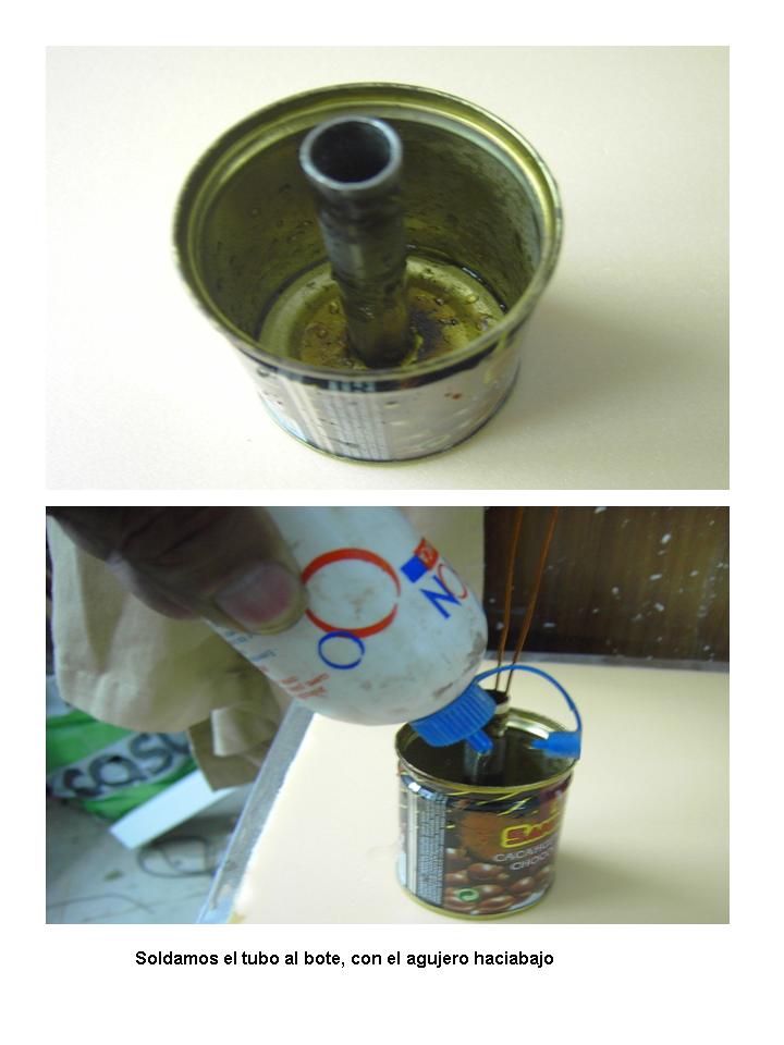 Ampliación a tu trabajo.- Si conectas un hilo al remache que sale de la lata por la parte inferior y el otro lo tienes en la parte superior, al darle corriente, la lata entera tiene orriente a 12 v. ya que la salida del remache no está aislada, aparte que el tubito de cobre da en el fondo, por que que esto mismo, creo, se podria hacer en un recipiente que no fuera conductor. Tambien se puede hacer como tu dices ahorrandose hacer el orificio, simplemente soldar el cable inferior al fondo de la lata.