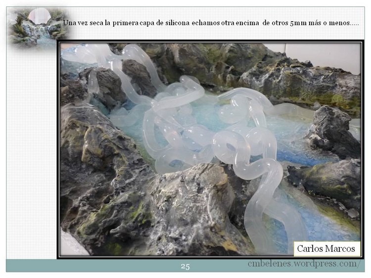 Quiero hacer constar y pido disculpas por ello, lo hice de una manera inconsciente pues no me dí cuenta que en las diapositivas 24 y 25 donde pone 50 mm de grosor entre capa y capa de silicona, tiene que poner 5 mm pues no tendría sentido si tenemos un grosor de tres centímetros para el cauce poner 5 centímetros en cada capa que es a lo que equivalen los 50 mm que puse, esto supondrían 10 centímetros entre las dos capas, algo impensable con las medidas que puse. Pido perdón por ello y quiero dar las gracias desde aquí a Bárbara compañera del foro Italiano que se dio cuenta de ello y me lo dijo. Un cordial saludo Pd. Añado las diapositivas corregidas