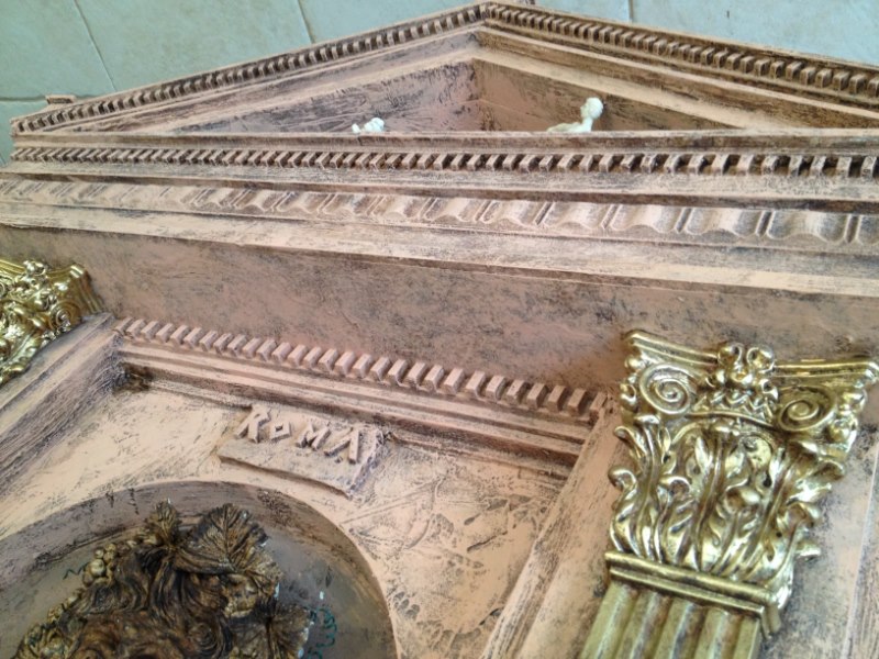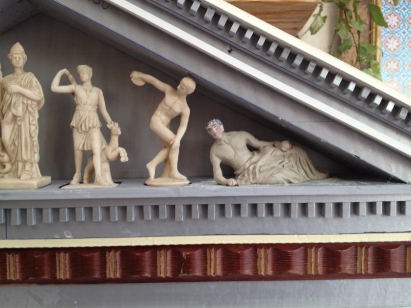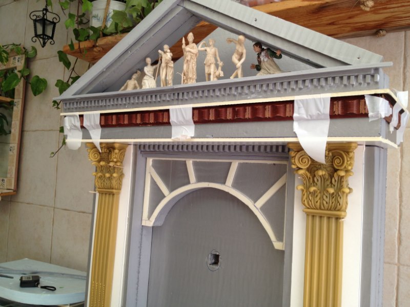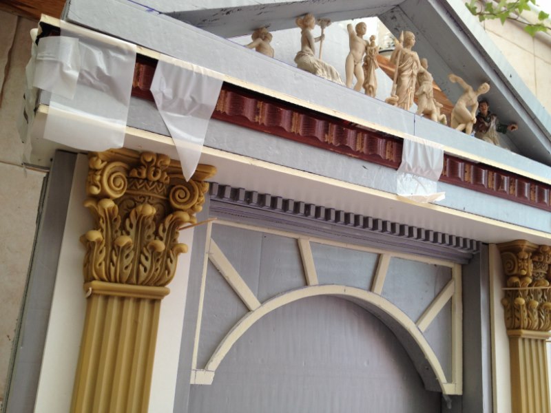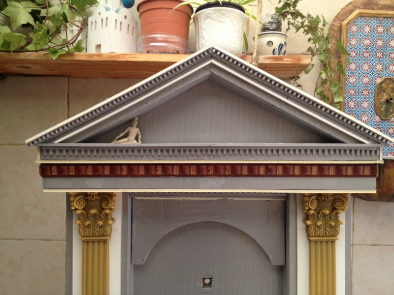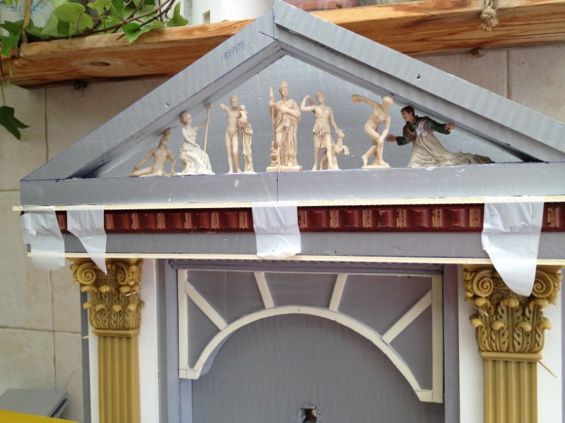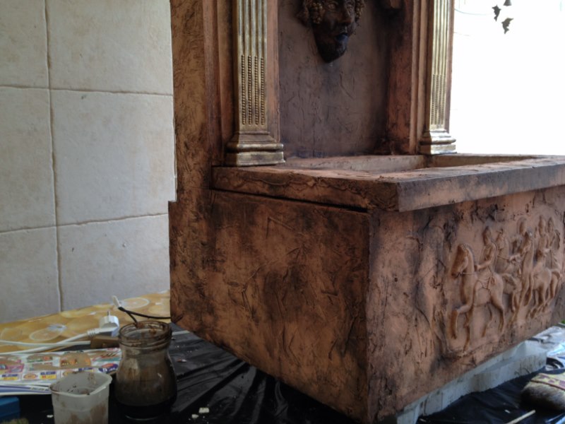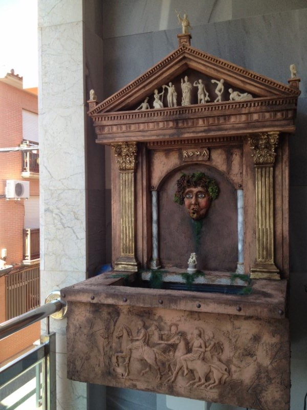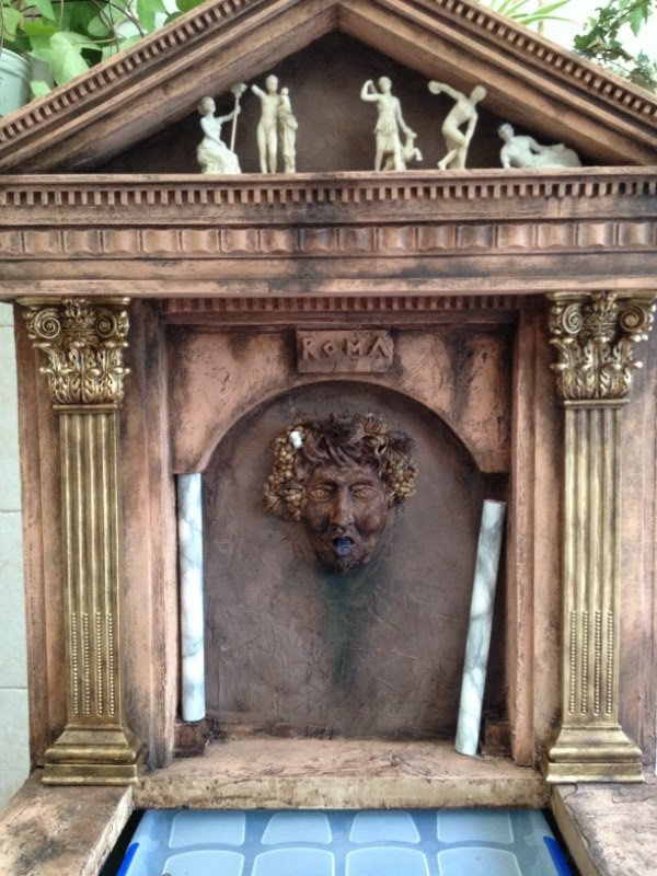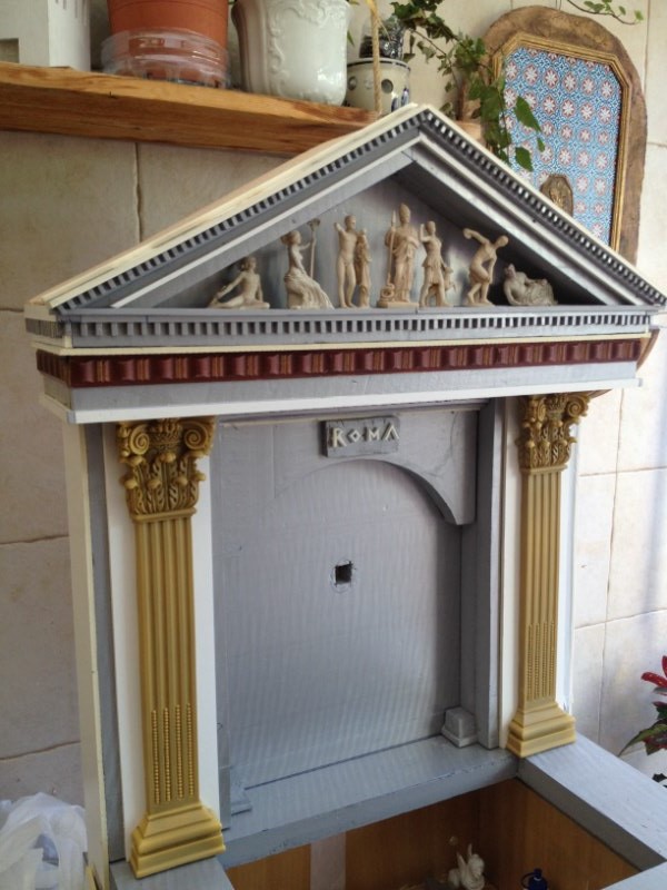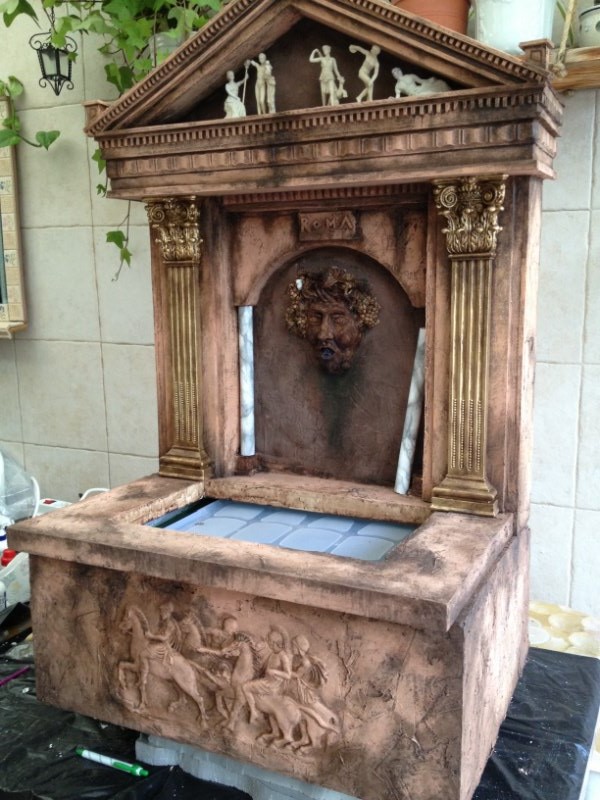 La Fuente de la Fortuna, es un proyecto que llevábamos en mente desde hacía tiempo. Es una fuente a tamaño real de construcción greco-romana arquitectónicamente hablando. Las figuras clásicas que aparecen en el frontón sin griegas, y dos de ellas tuvieron que ser modificadas. La segunda por la izquierda era la Venus de Milo, y la transformamos para que estuviera sentada y con brazos.