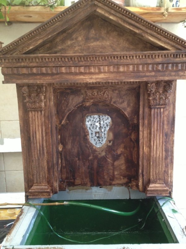 La fuente está ubicada en mi casa y orientada a poniente, desde Abril hasta mediados de septiembre por la tarde y cuando los últimos rayos de sol colean en el horizonte, está la fuente bañada de sol, haciendo que las dos columnas doradas brillen.