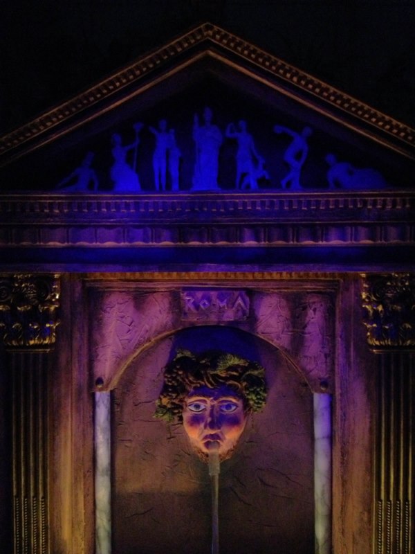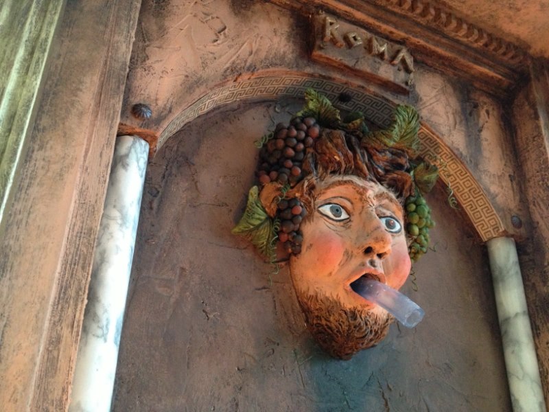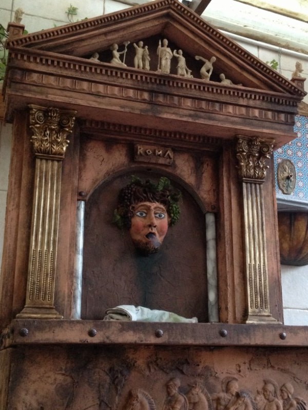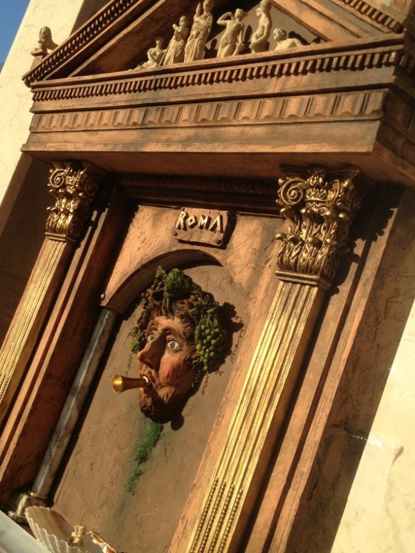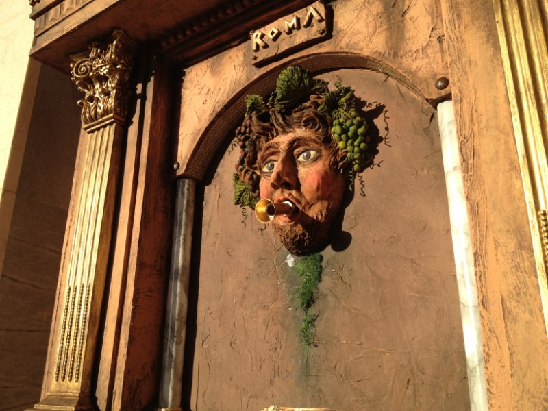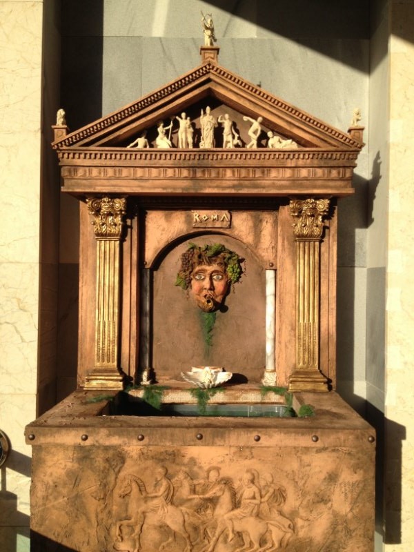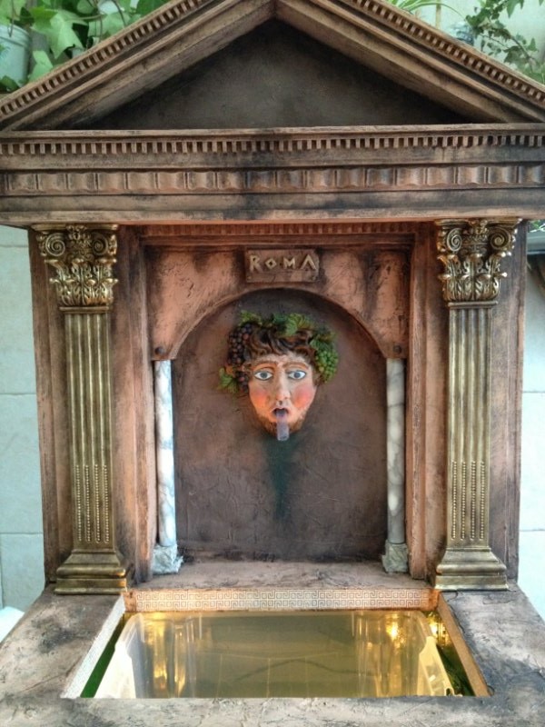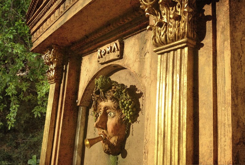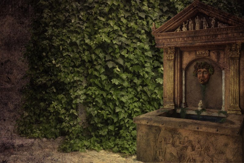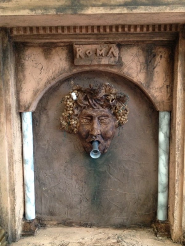 El rostro de Baco, a quien se le dedica la fuente en ésta historia ficticia que hemos inventado, está basado en pinturas dedicadas a la misma Deidad, con unos rasgos entre demoniacos y de un hombre que están sonrosado de tanto beber vino. En su boca tiene una trompeta dorada y de ella sale agua.