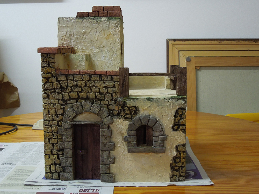 Esta muy bonita :), en cuanto a pintura jugaria con mas colores en las piedras para que unas resalten por sobre otras y en las esquinas de puertas y ventanas te sugiero que "manches" la pared blanca con colores que asemejen el musgo y la humedad. Te envio una toma de unas casitas de mi Belen de hace 3 años en el se ve eso del manchado de musgo para una idea con imagen, espero suba