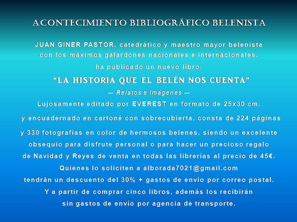 El maestro mayor belenista alicantino Juan Giner Pastor en “LA HISTORIA QUE EL BELÉN NOS CUENTA: Relatos e Imágene s” describe la evolución del belenismo desde sus inicios, con el florecimiento que alcanzó en Nápoles y la renovación aportada por Cataluña. También relata y nos muestra todas las escenas del Belén a través de breves pero sentidos textos, acompañados de 330 artísticas fotografías a color de preciosos belenes, muchas de gran tamaño o a doble página, en un lujoso libro de 224 páginas, con un formato de 30x25 cm encuadernado en cartoné y con sobrecubierta.