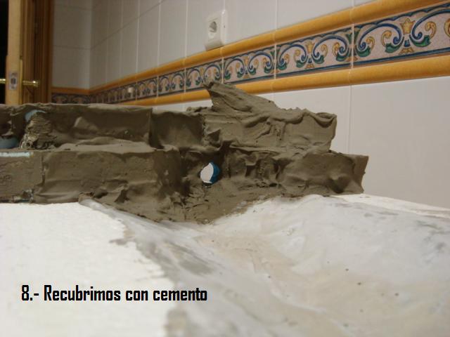 Ingredientes: Porex, cemento, pinturas acrílicas, barniz impermeabilizante, fiambrera y motor-bomba con macarron de plástico para llevar el agua hasta el principio del río.