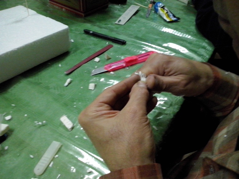 Utilizando madera de balsa, que se pude obtener de las cajas de fruta, esta se corta a la medidas deseada. Las vetas se realizan con un cutter, repasándode posteriormente con un cepillo metálico.