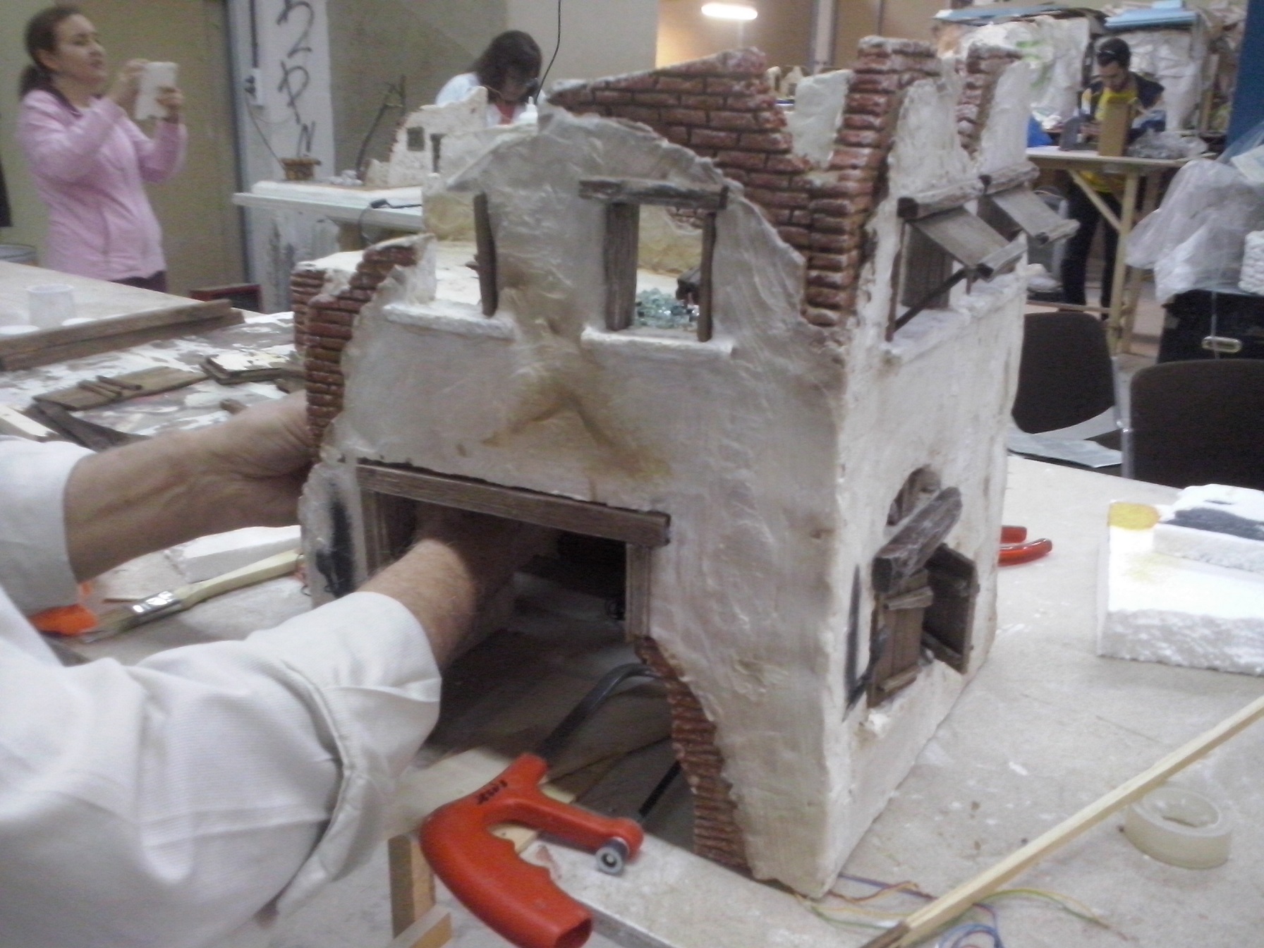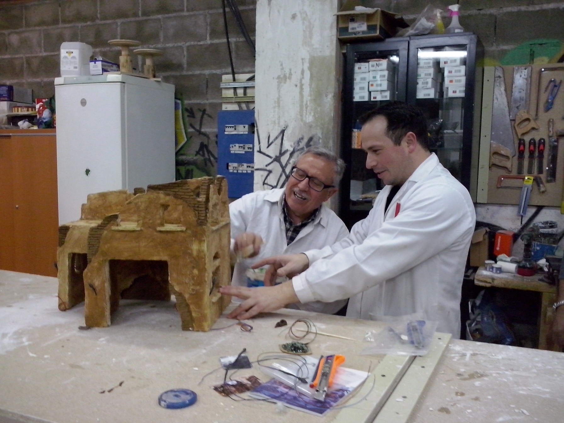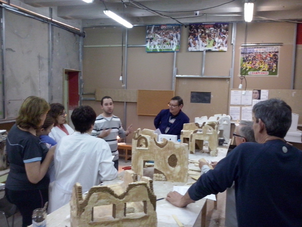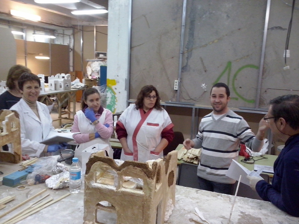 En esta penúltima semana se ha ido acoplado muchas piezas de madera, enlazando los cables de las antorchas e iluminación interior hacia la parte trasera. Además se ha puesto la base con la casa. En el nivel 1 han realizado ya los huecos donde van a ir expuestas las figuras, a falta de los pequeños remates. Nuestro compañero David Baena estuvo dando una pequeña charla a los alumnos explicándoles sobre las proporciones de las figuras en las construcciones.