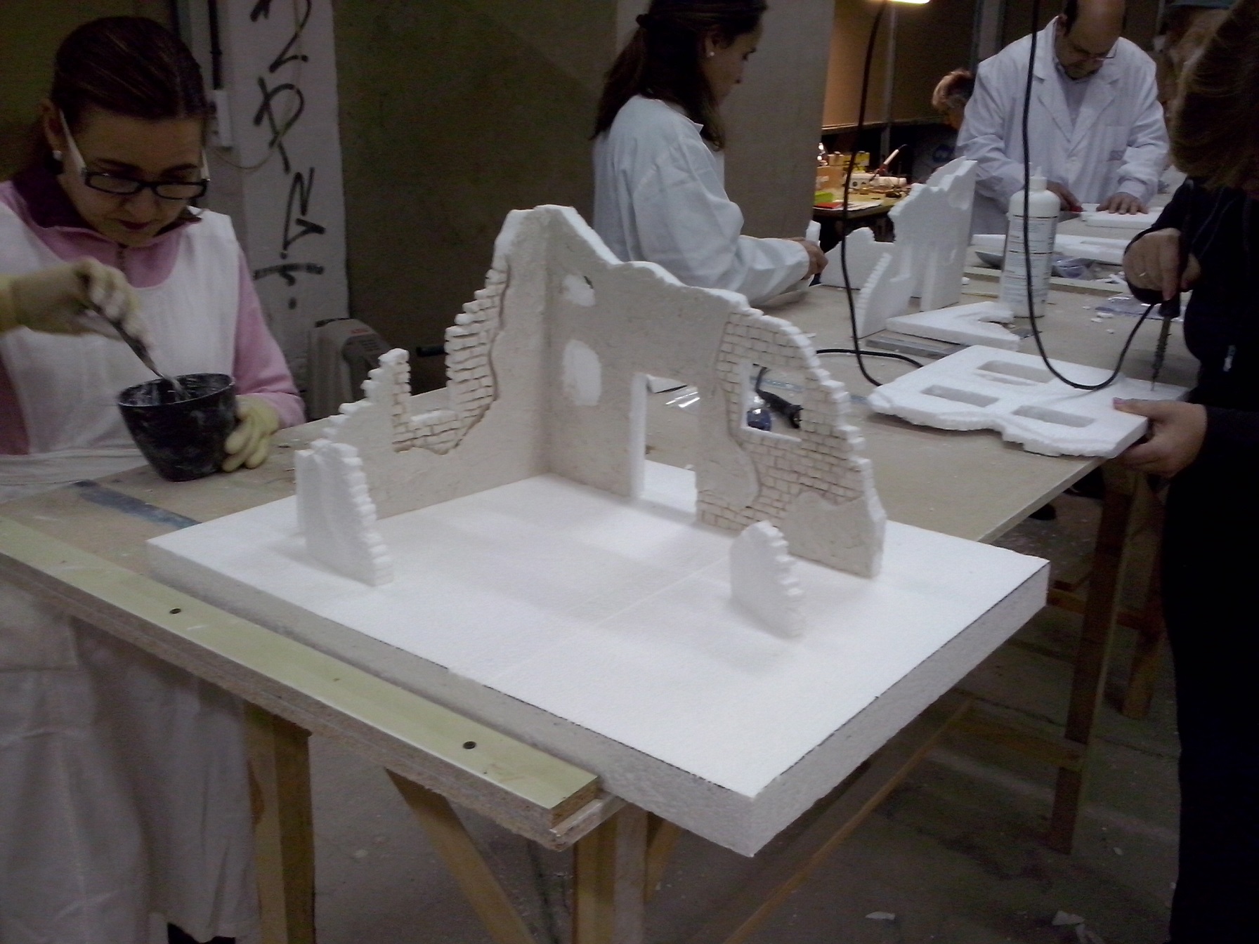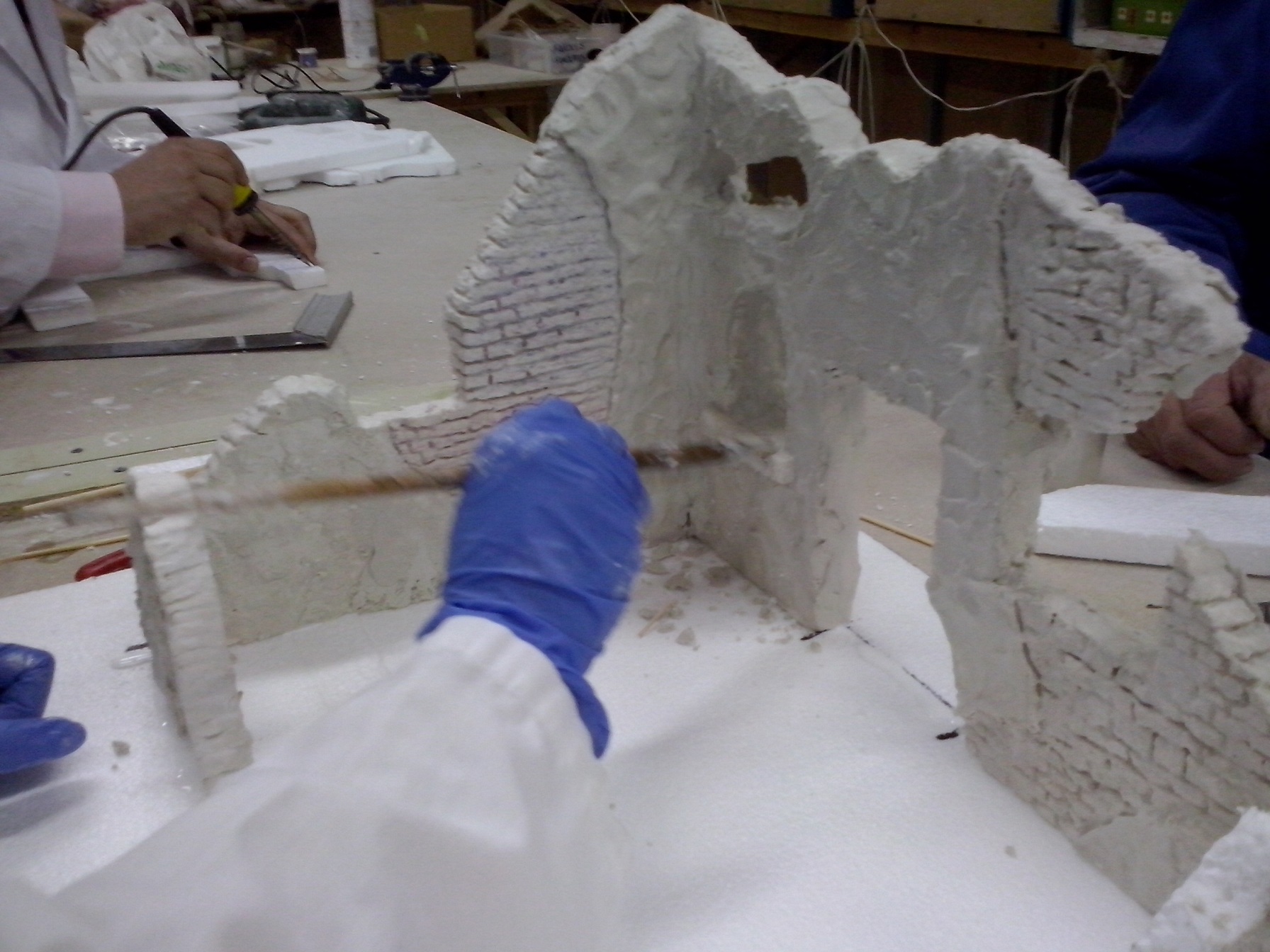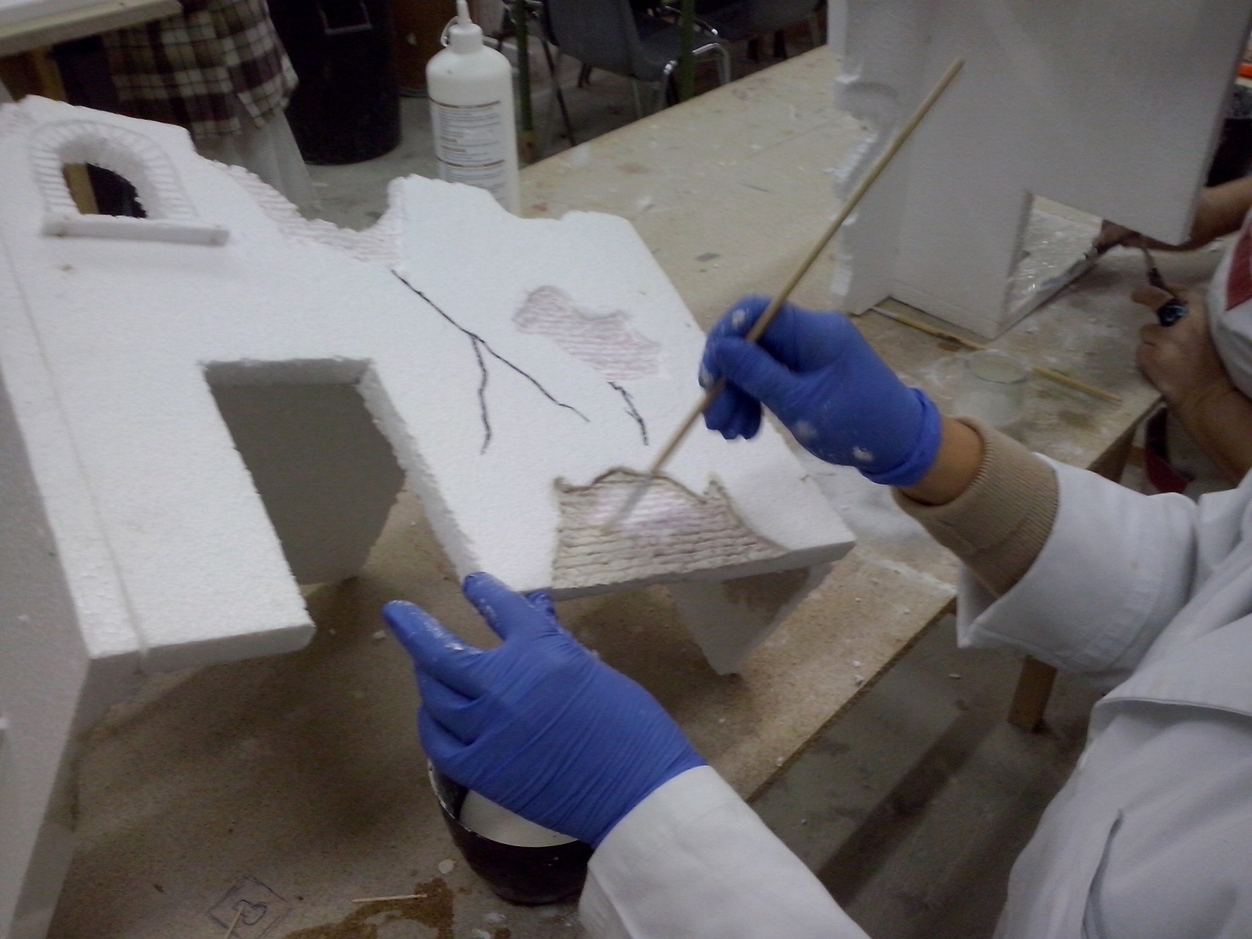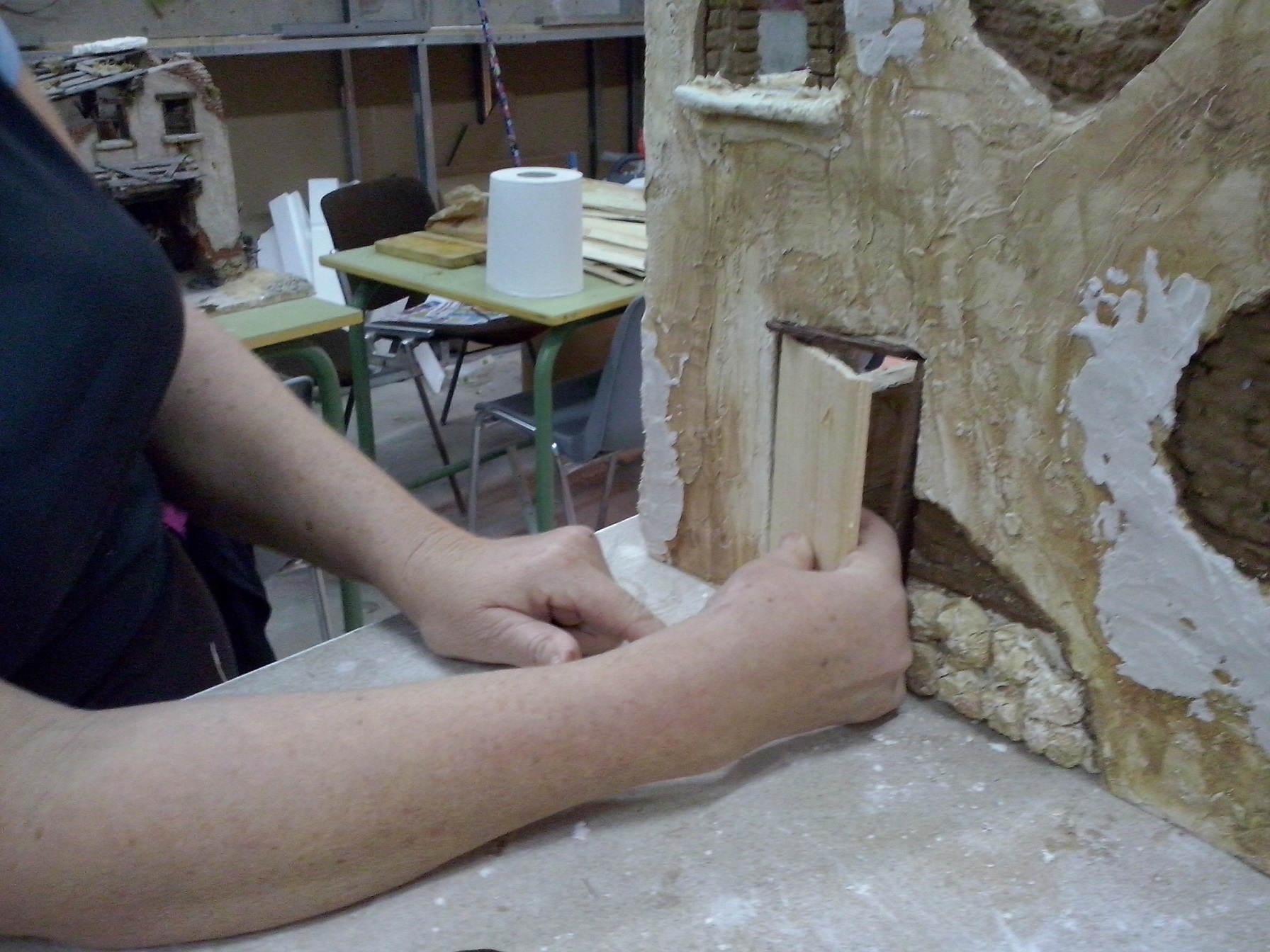 En esta penúltima semana se ha ido acoplado muchas piezas de madera, enlazando los cables de las antorchas e iluminación interior hacia la parte trasera. Además se ha puesto la base con la casa. En el nivel 1 han realizado ya los huecos donde van a ir expuestas las figuras, a falta de los pequeños remates. Nuestro compañero David Baena estuvo dando una pequeña charla a los alumnos explicándoles sobre las proporciones de las figuras en las construcciones.