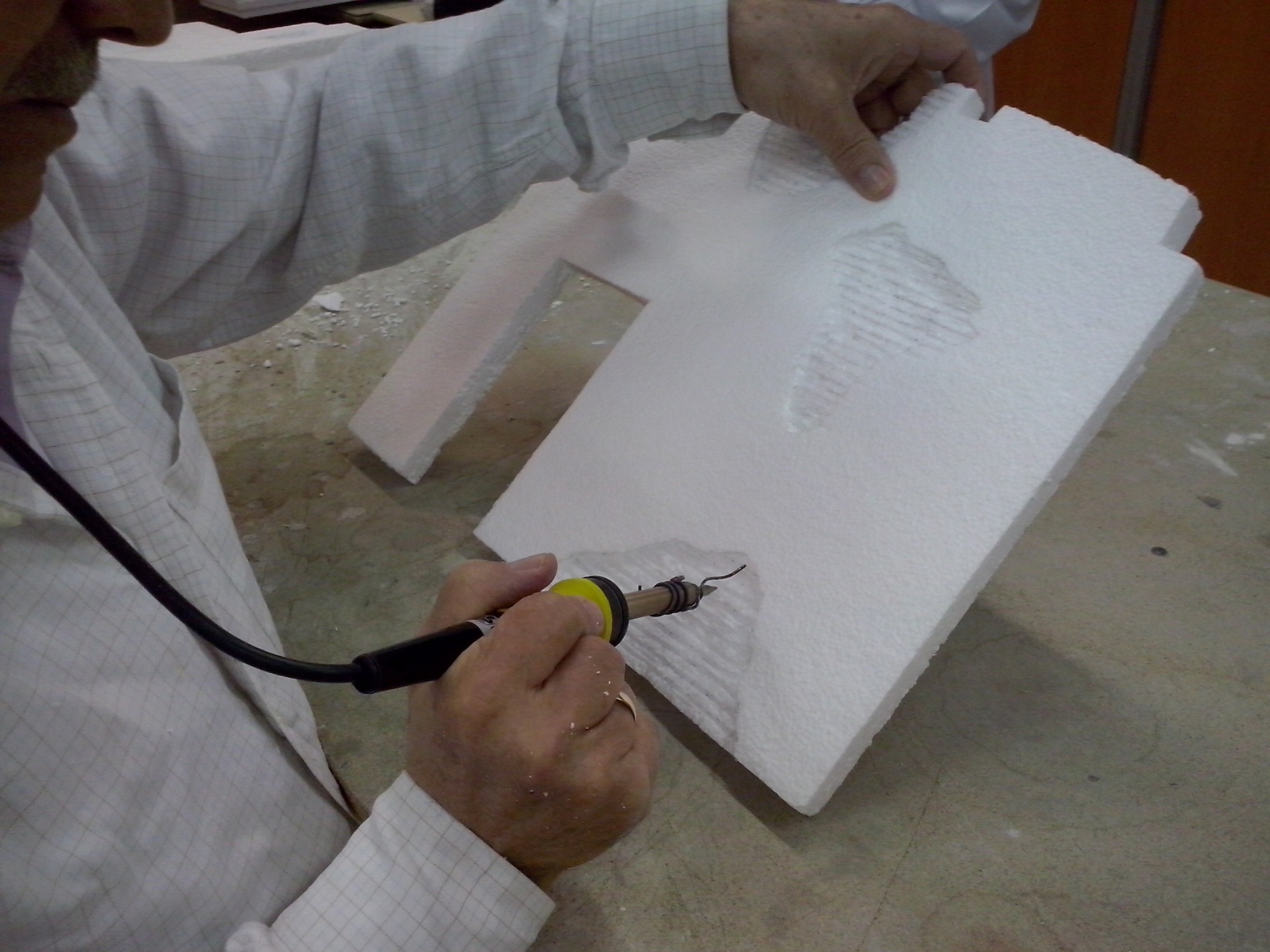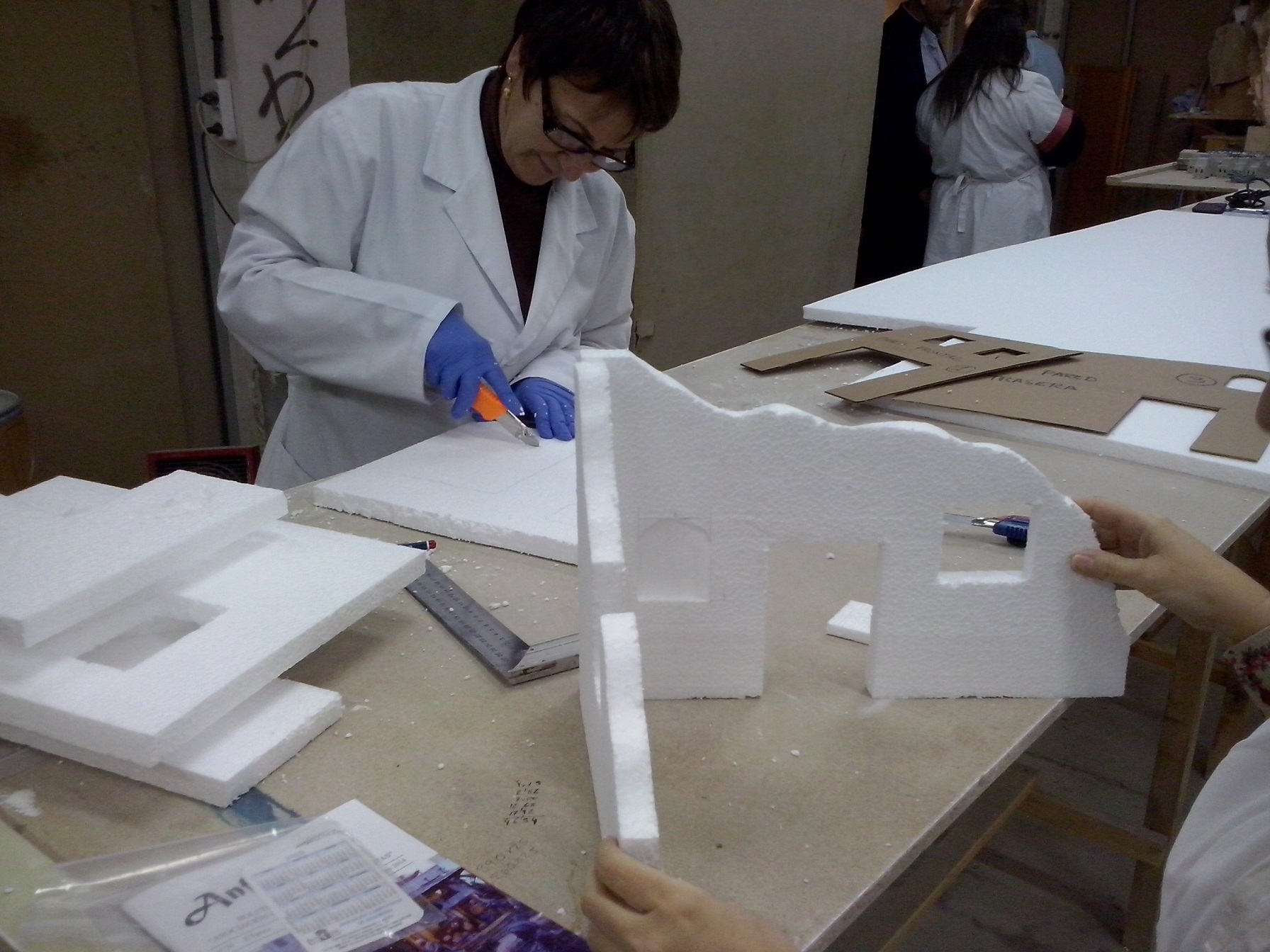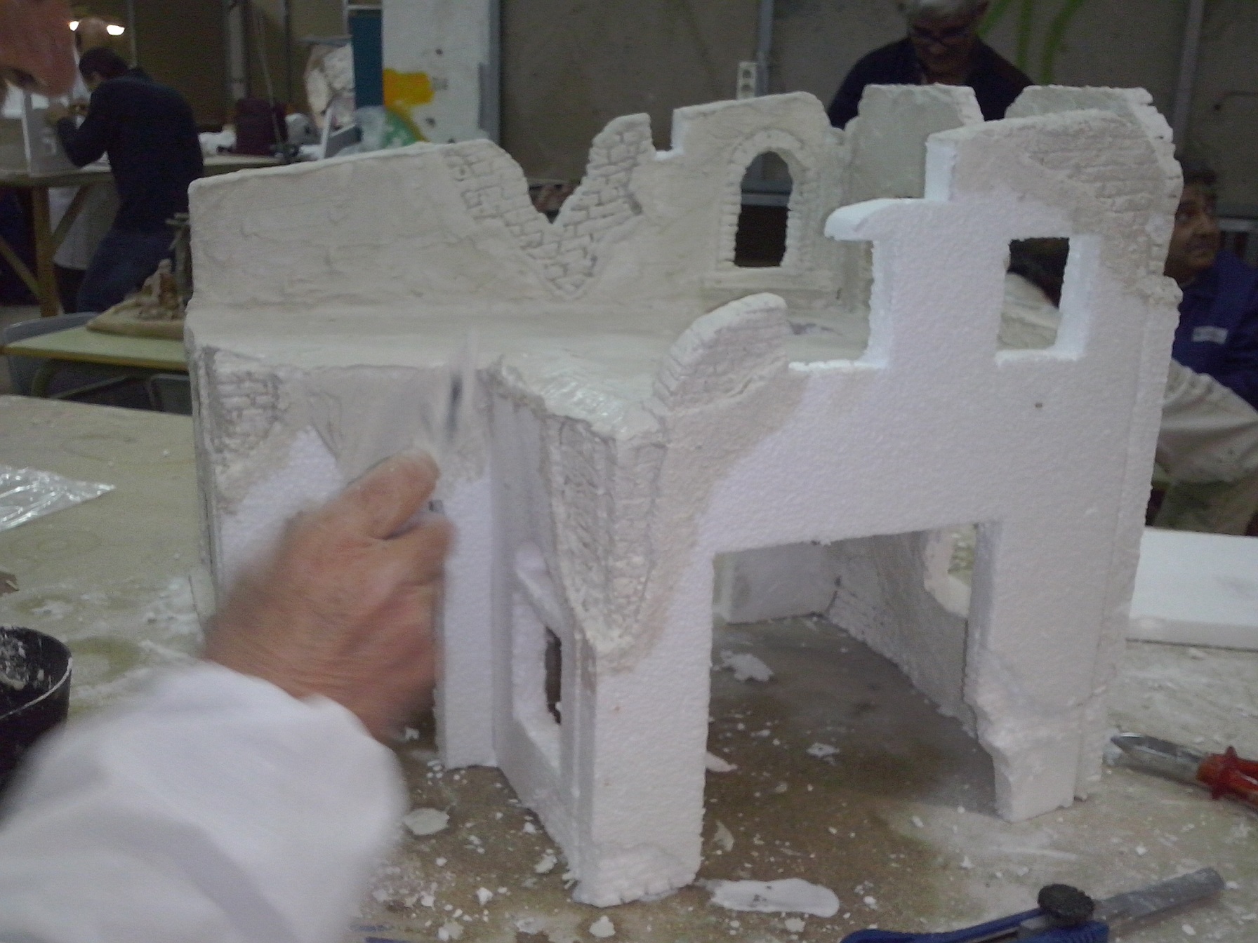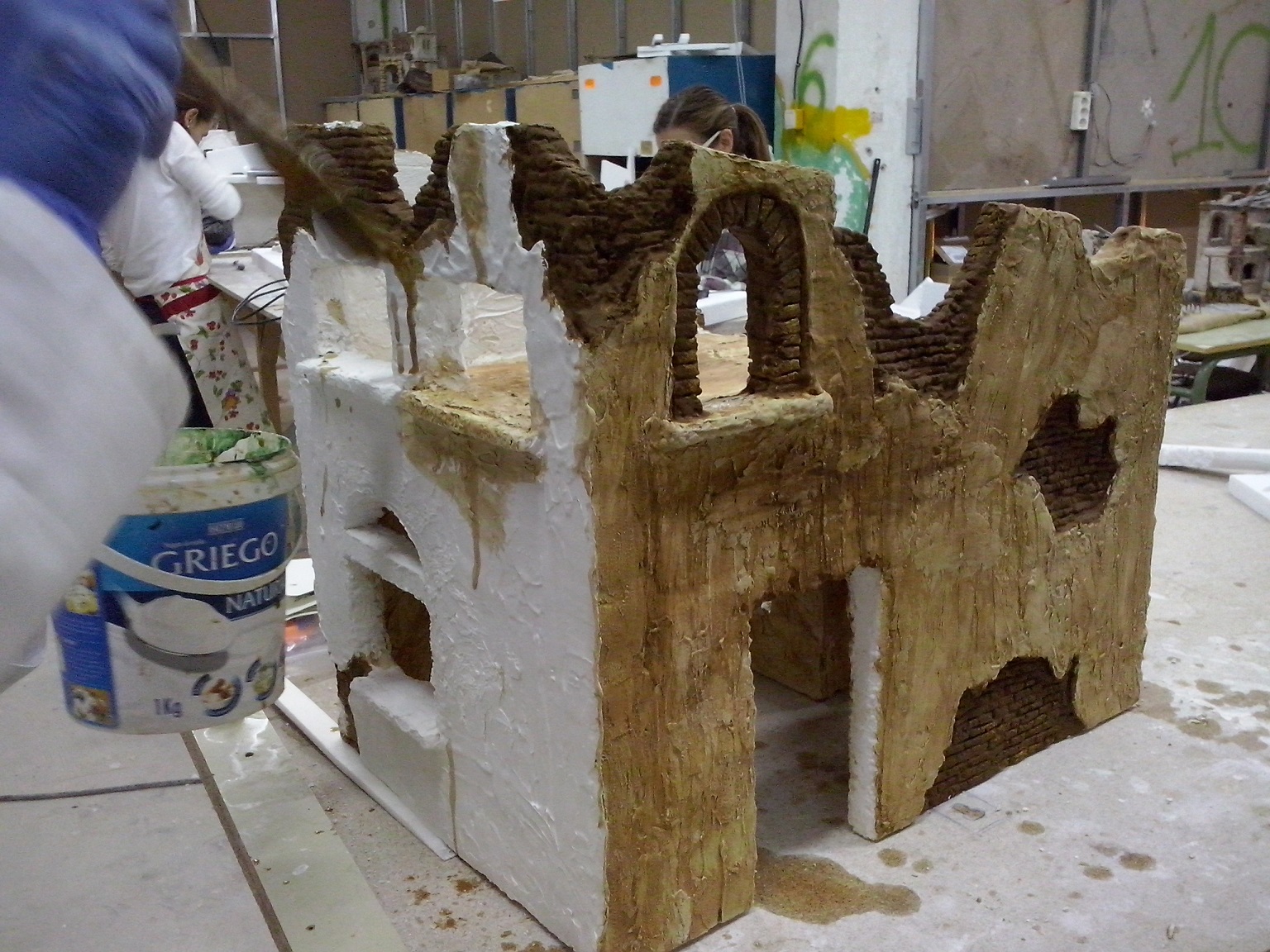 En esta penúltima semana se ha ido acoplado muchas piezas de madera, enlazando los cables de las antorchas e iluminación interior hacia la parte trasera. Además se ha puesto la base con la casa. En el nivel 1 han realizado ya los huecos donde van a ir expuestas las figuras, a falta de los pequeños remates. Nuestro compañero David Baena estuvo dando una pequeña charla a los alumnos explicándoles sobre las proporciones de las figuras en las construcciones.