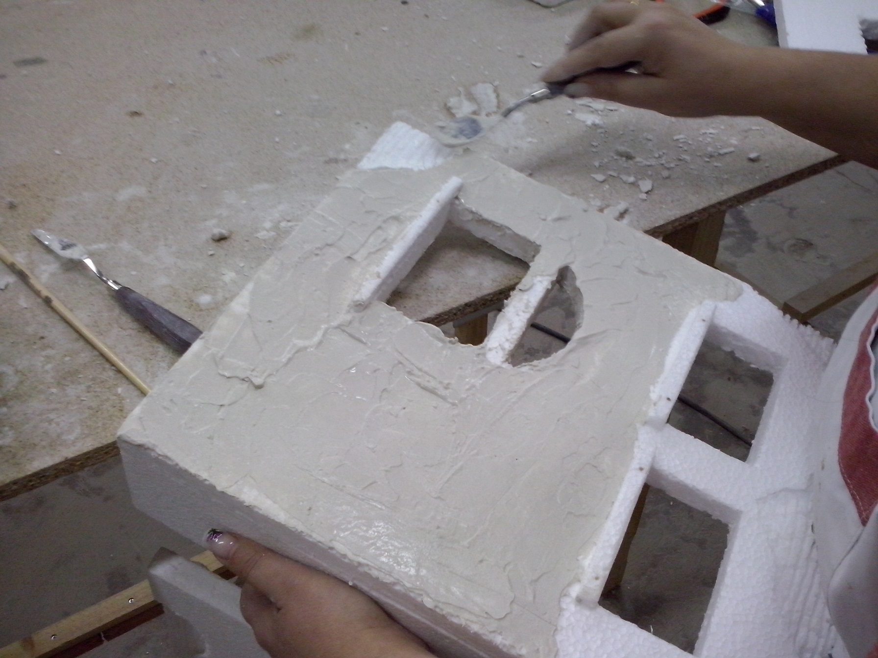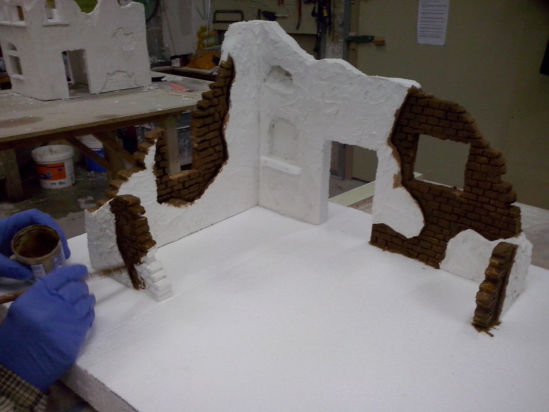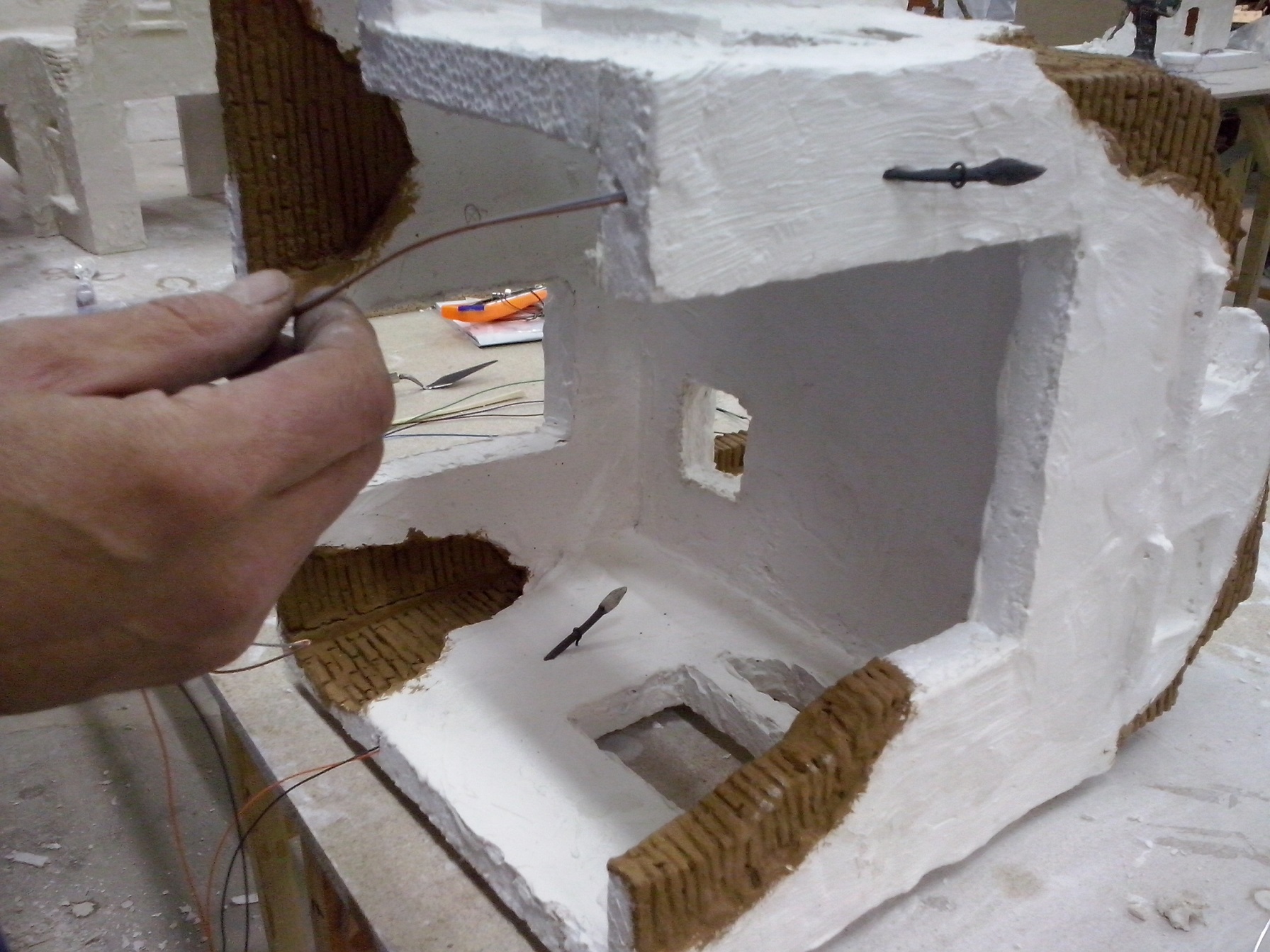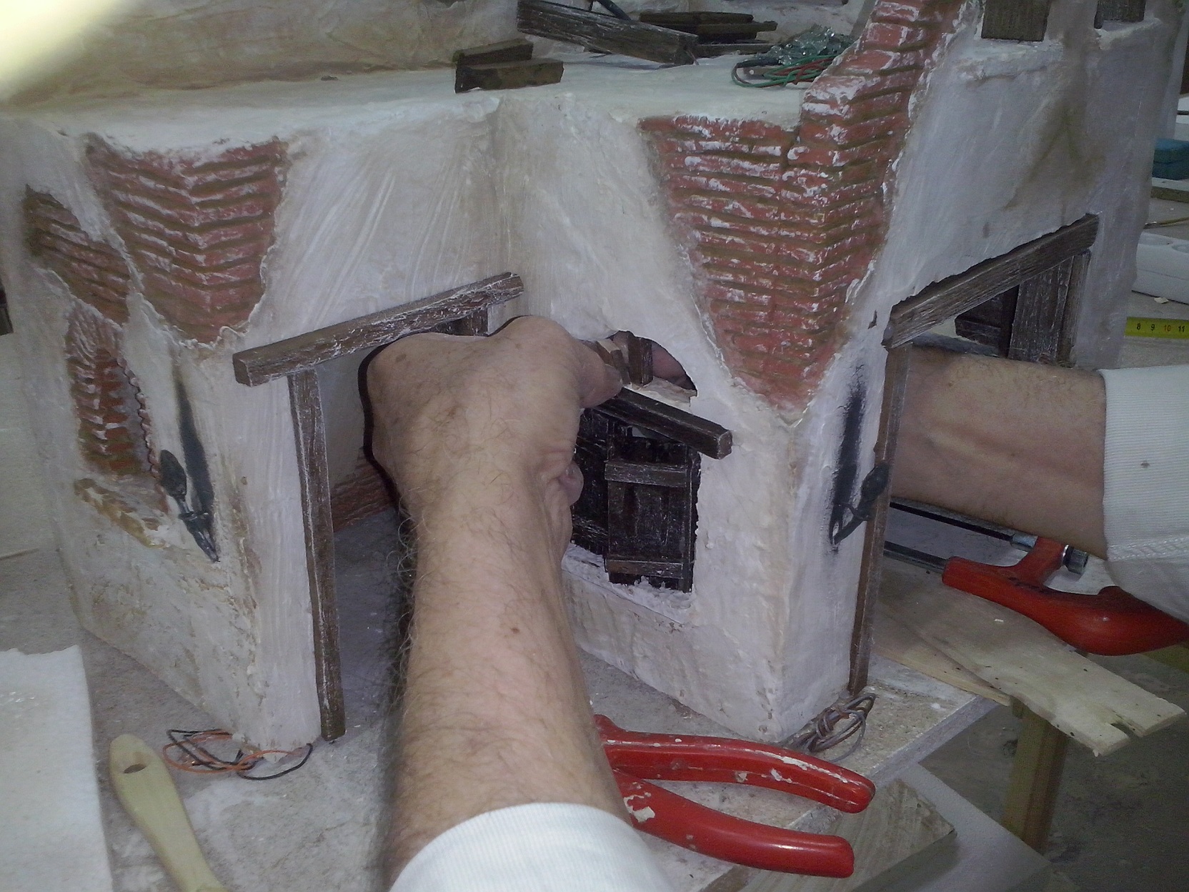 Despues de aplicar la escayola a las paredes de la casa y una vez seca, procedemos al pintado de los ladrillos, para ellos utilizamos tempera de color marrón. Esta misma pintura, pero un poco más aguada, nos servirá de color de fondo para las paredes. Anteriormente, hemos realizado gran parte de la instalación eléctrica, para evitar con ello que esto entorpezca el pintado de las paredes.