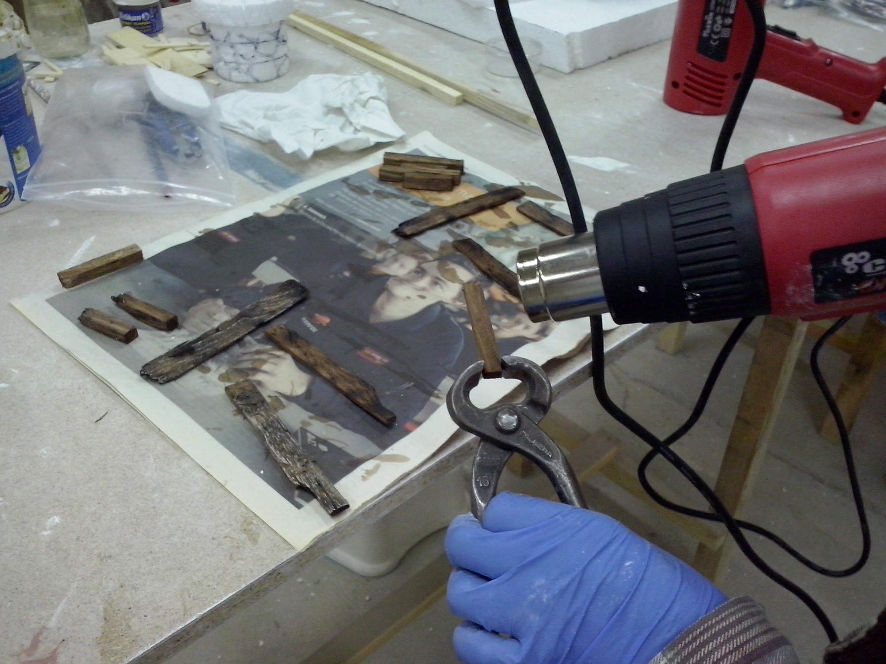 Para conseguir imitar los tonos de la madera, se disuelve nogalina en agua. El color resultante se aplica sobre los diferentes elementos realizados.