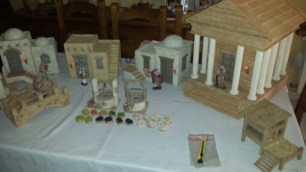 Adjunto unas cuantas fotos del pedido... un templo espectacular, unas casas para el pueblo con luces led (una simulación de antorchas fantástica), un gallinero, una tapia con puerta, un puente, cestos de frutas, ..... y al final me decidí por cogerle también dos pozos (y ya tengo 4 pero es que están increibles).