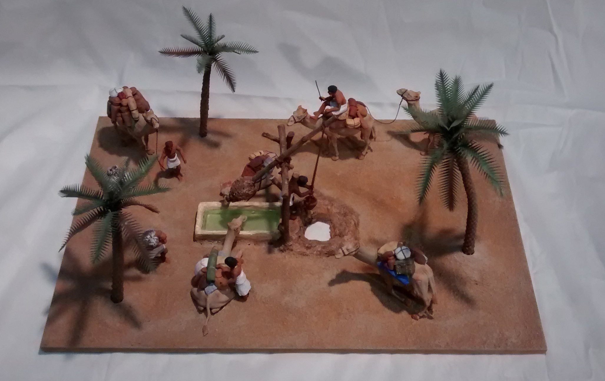 Para realizarlas utilizo figuras de plomo de 54mm, que las modifico (los brazos, piernas… para darle otra postura) y las pinto a mano. Tienen gran realismo y quedan geniales para elaborar la zona egipcia en un belén.