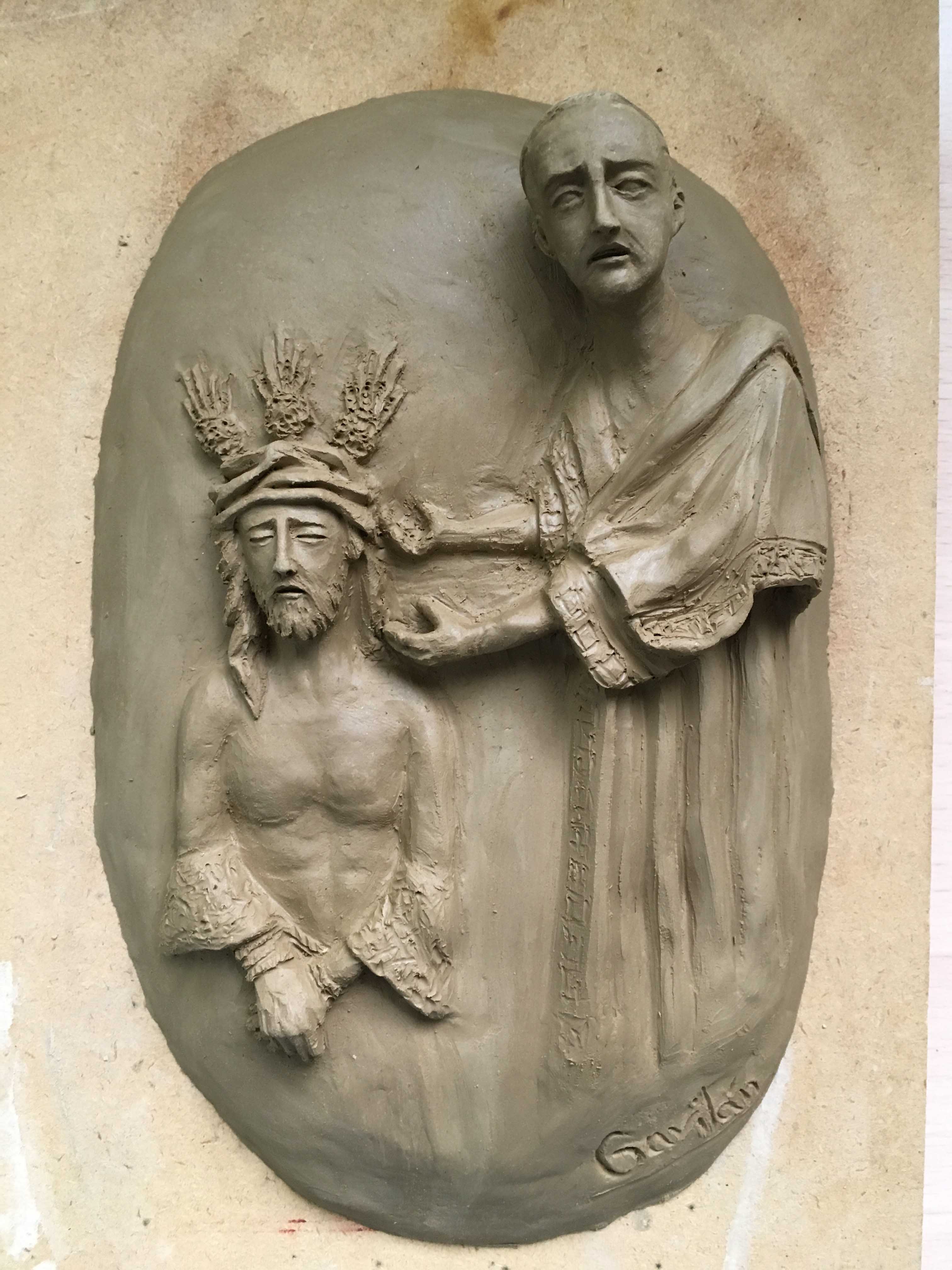 Cartela modelada en barro, en la que se representa la escena en que Poncio Pilatos presenta a Jesús de Nazaret al pueblo judío para ser juzgado.
