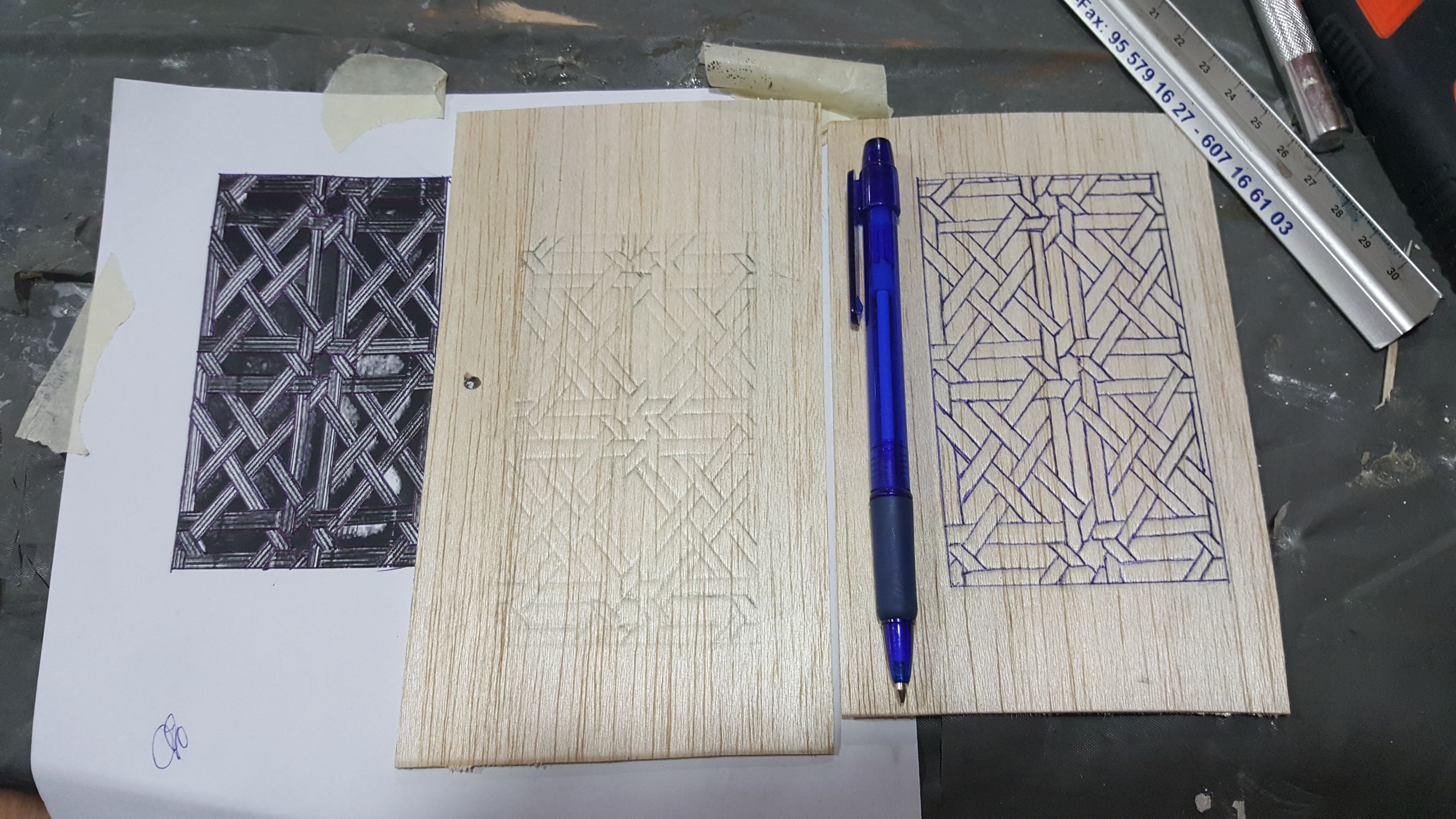 4. Una vez realizados todos los pasos anteriores nos disponemos a calcar. Cogemos el lápiz o bolígrafo y repasamos todas y cadas una de las líneas y aristas de la celosía. No tengáis miedo al apretar, todo lo contrario, hay que ejercer cierta presión sobre las lías para que quede bien marcado en la madera la celosía.