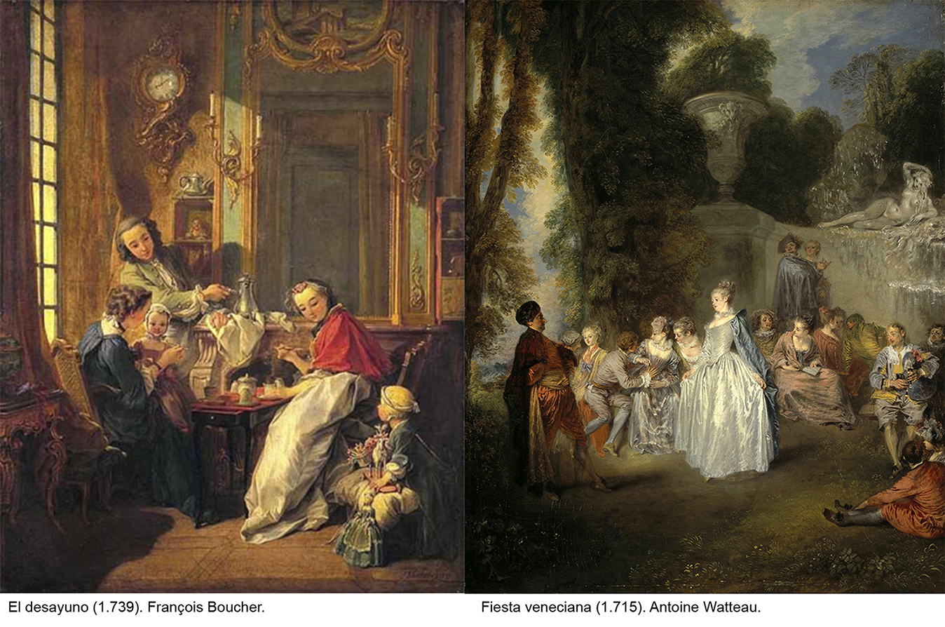 La sensación era la mezcla de las intenciones de ese estilo de dos de esas pinturas, una "fiesta veneciana" de Watteau, donde no existe el centro, los elementos del cuadro se funden en el ambiente festivo como un todo...y "el desayuno" de Boucher, donde la ausencia de expresividad de los personajes, el fondo, los dorados, la claridad y belleza de la escena, congelan el paso del tiempo.