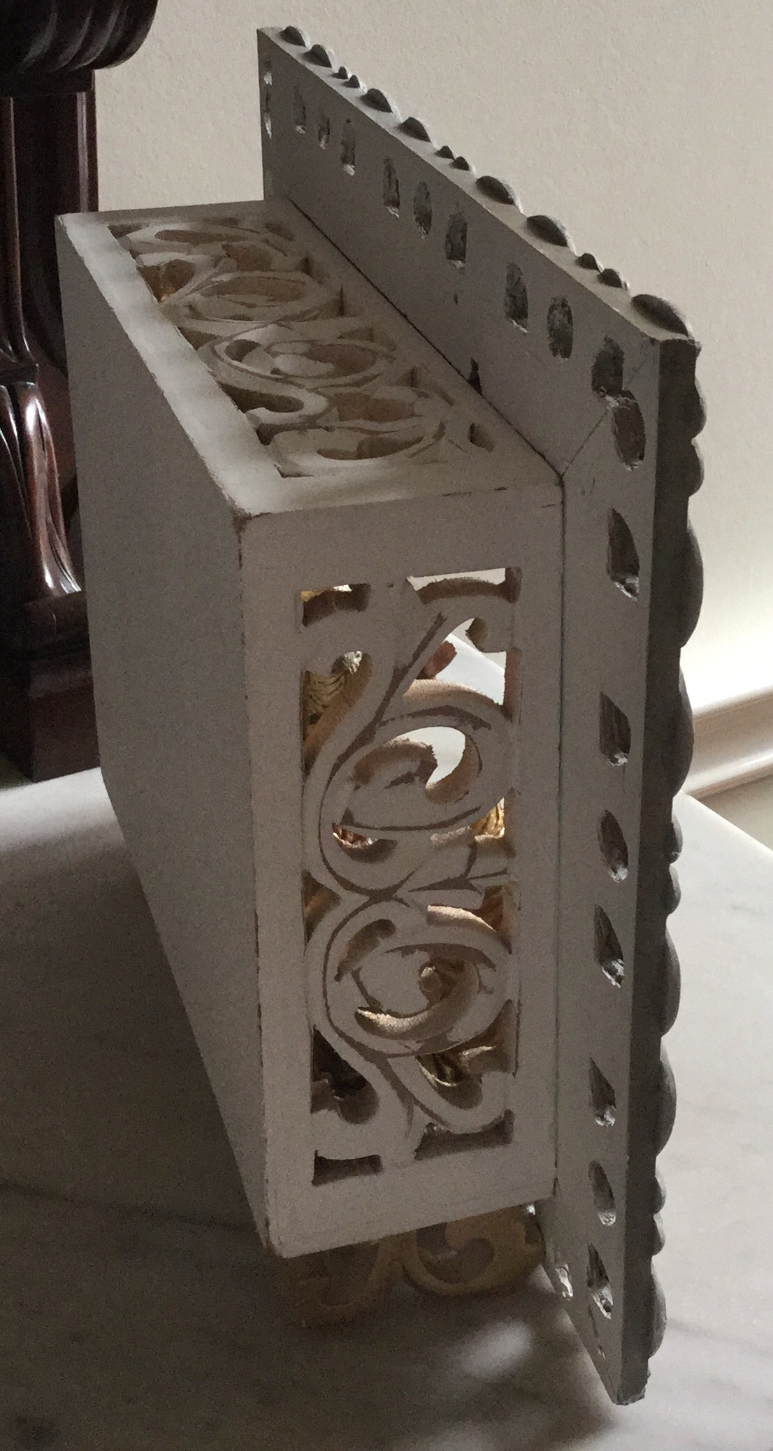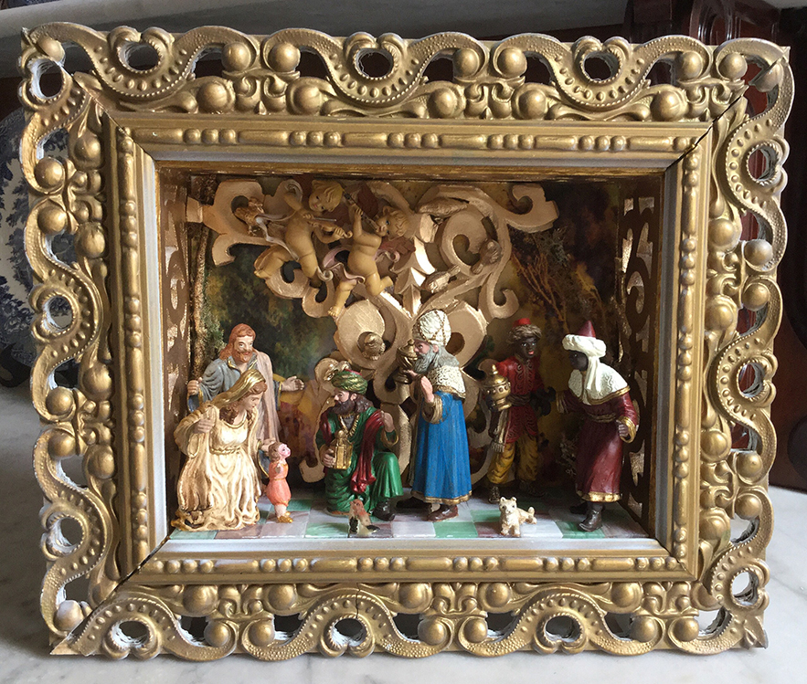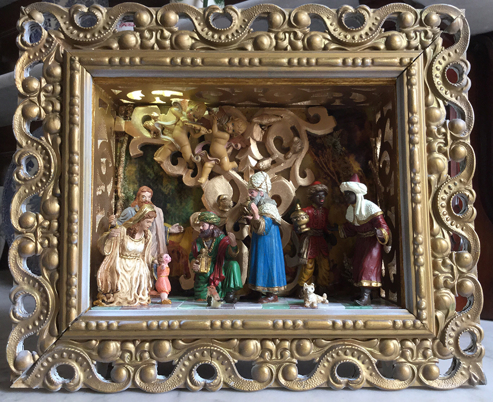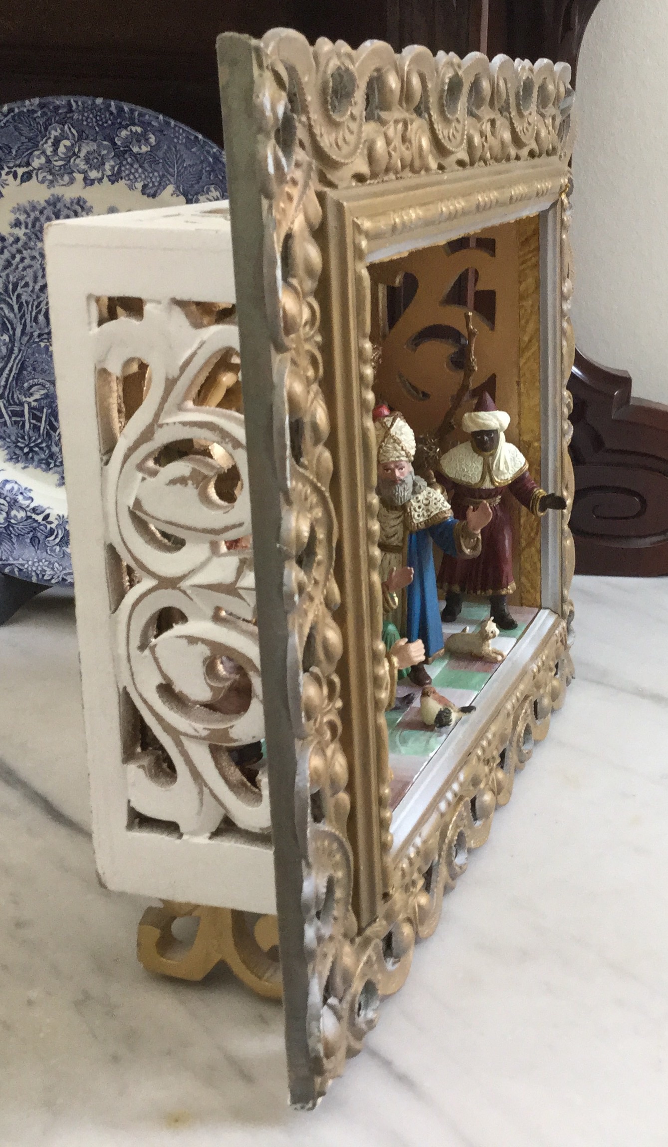 Esta vez reciclando una caja de cartón prensado estropeada con motivos "rocaille" en laterales y tapa, las figuras principales de aproximadamente 10cms., son de Oliver (buscadas por reminiscencias a este estilo y algo "venecianas") y un marco viejo con motivos parecidos. El fondo del diorama lo compone parte de la "rocaille" de la tapa de la caja, figuras de animales, ángeles-cupidos y fragmentos de una pintura de Fragonard. Las figuras de la Epifanía están repintadas (estaban enteladas), quitadas las peanas y algunas transformadas para la escena. Y la figura del niño Jesús (4cm) está hecha con pasta de modelar de secado al aire.