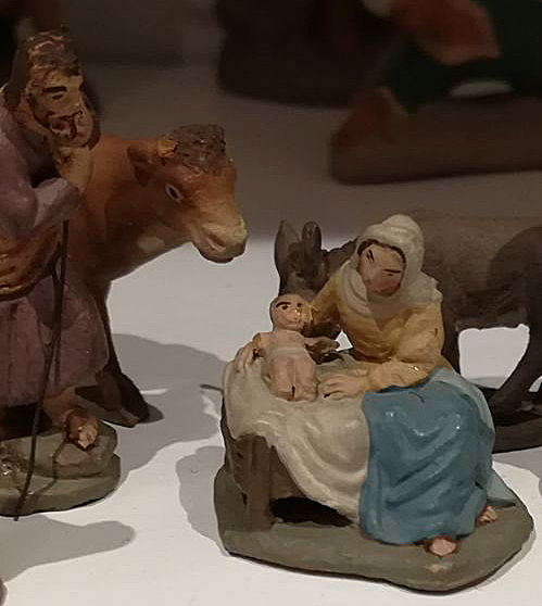Las figuras son de terracota blanca, se detecta la época mirando la peana por debajo porque a principios de siglo xx y la postguerra el barro que se podía comercializar era con bajo contenido ferroso, además los pesebres de la época eran de corcho y musgo, por lo que la peana por arriba se pintaba de color verde para simular el fondo al taparla con el musgo.