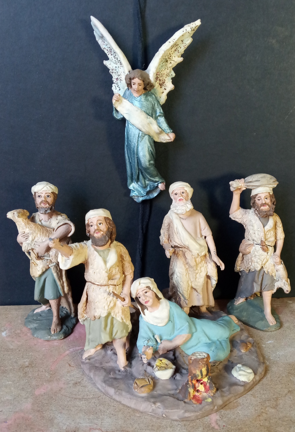 Las figuras están policromadas, en peana individual y cumplen con las características anteriormente descritas menos el color de la base, no aplicable a estas figuras por su tamaño y temática más cercano a las tallas de madera que a las figuras para el pesebre…