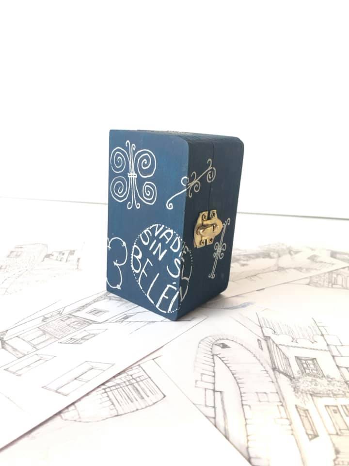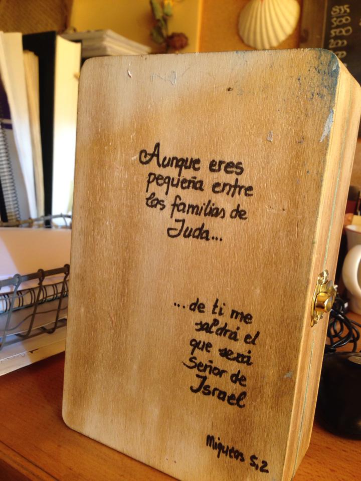 Como se ve, son belenes realizados en pequeñas cajas de madera, divididos en dos partes, realizados para ser expuestos con la caja abierta, pero muy bien diseñados para que incluso los elementos que se salen de la caja encajan con los de su "contracaja" una vez cerrada. Además, suele incluir en el fondo del belén o en el exterior de la caja (cuya decoración también cuida con esmero) pequeñas citas bíblicas u otros motivos o eslóganes. Si no me equivoco, también ha realizado alguna caja como proyecto en común con otros belenistas, con cajas a medio hacer viajando de aquí para allá para que otras manos continuasen el trabajo.