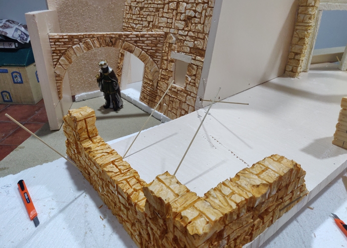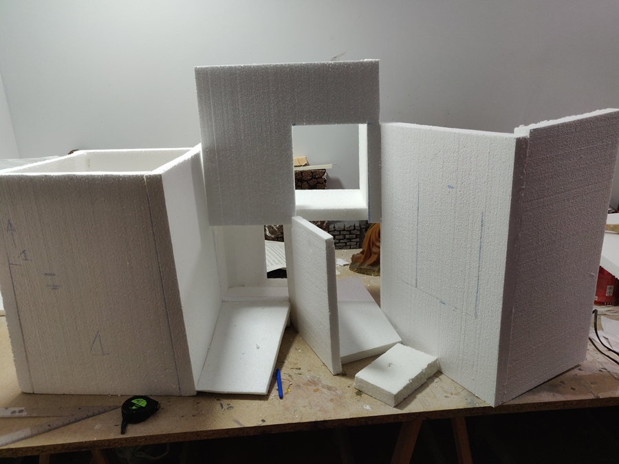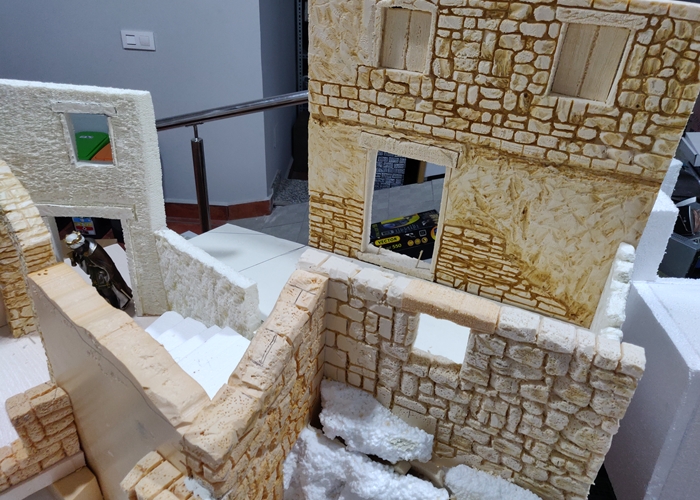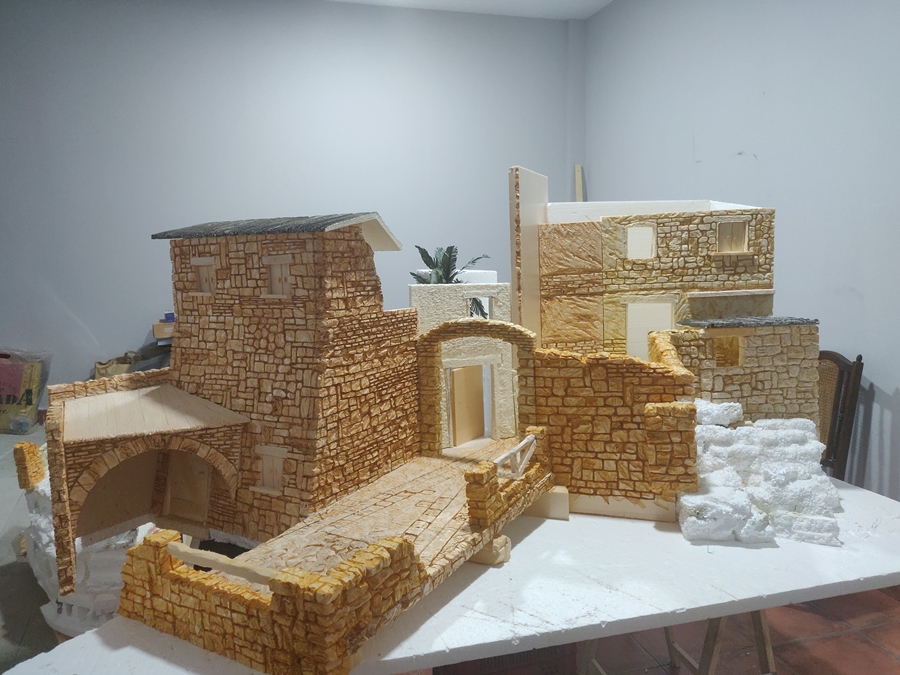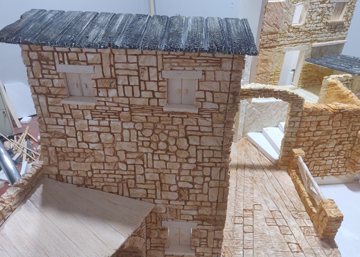 Siguiendo con el proceso que he avanzado un poco, os enseño fotografias de la transformación de una de las construcciones. Esta, se trata de la edificación donde se va a situar la escena del Registro. Está constituida de una edificación con tres viviendas, una de las cuales se va a emplear para presentar la escenificación de La Virgen María y San Jose cuando se trasladan de pueblo para inscribirse en el registro. Como dije anteriormente, dicha construcción parte de una del amigo "Artesano del Belén", el cual ruego me perdone por no haber podido llegar a su perfección en la confección de la misma.