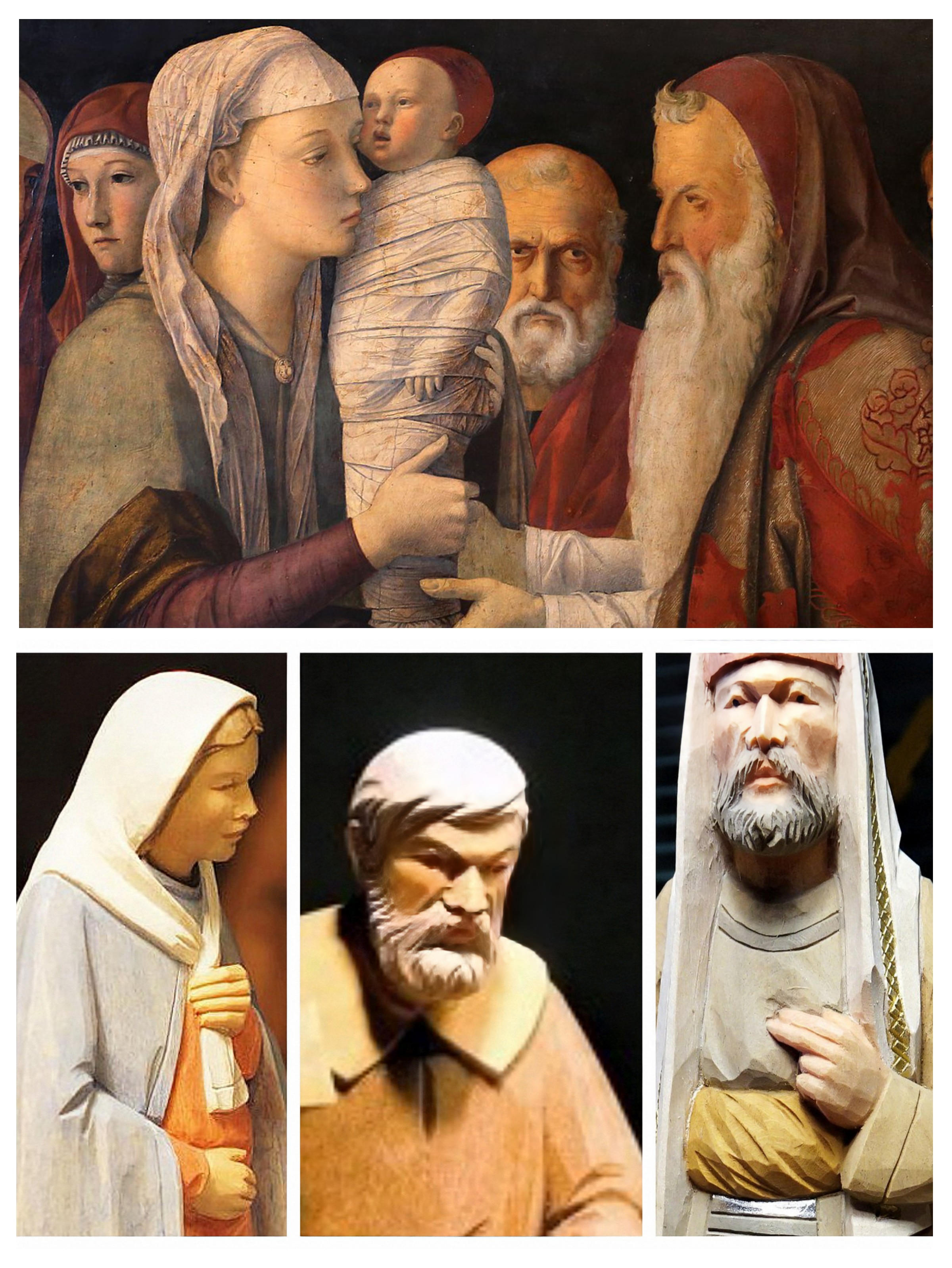 Ich dachte über die Möglichkeit nach, die Szene der Darstellung des Jesuskindes im Tempel nach dem Gemälde von Giovanni Bellini in Figuren zu interpretieren. Die Idee wäre, die Hauptfiguren darzustellen: die Jungfrau mit dem Kind, den Heiligen Josef und Simeon.