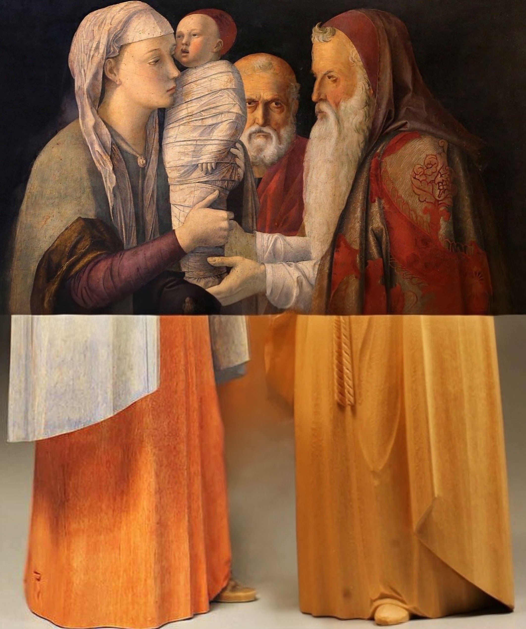 Es un encargo de 'órdago': recrear la escena de La Presentación en el Templo de Bellini con figuras completas😉. No sé exactamente cómo gestiona Reinhold sus encargos ni si habría disponibilidad de espacio y tiempo para llevarlo a cabo. Pero, sin duda, su estilo encajaría perfectamente con la expresividad y el detalle de los personajes del cuadro.