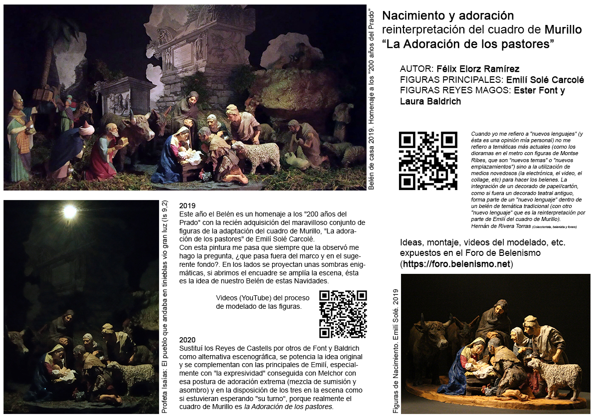 Estoy preparando tres paneles explicativos (tamaño Din-A3) que acompañaran al montaje belenístico de la Iglesia, serán finalmente cuatro! "Cajas escénicas", ya que el espacio es bastante grande y quedaría un poco desangelado, al Nacimiento y adoración(Murillo) y Huida a Egipto(Goya) se le sumará dos cajas representando la escena de la Cabalgata de Reyes con figuras de Daniel hijo(tendré que improvisar!) que con el cuadro de La adoración de los pastores de Murillo (1/3 del tamaño real) formarán el conjunto en la entrada a la Iglesia.