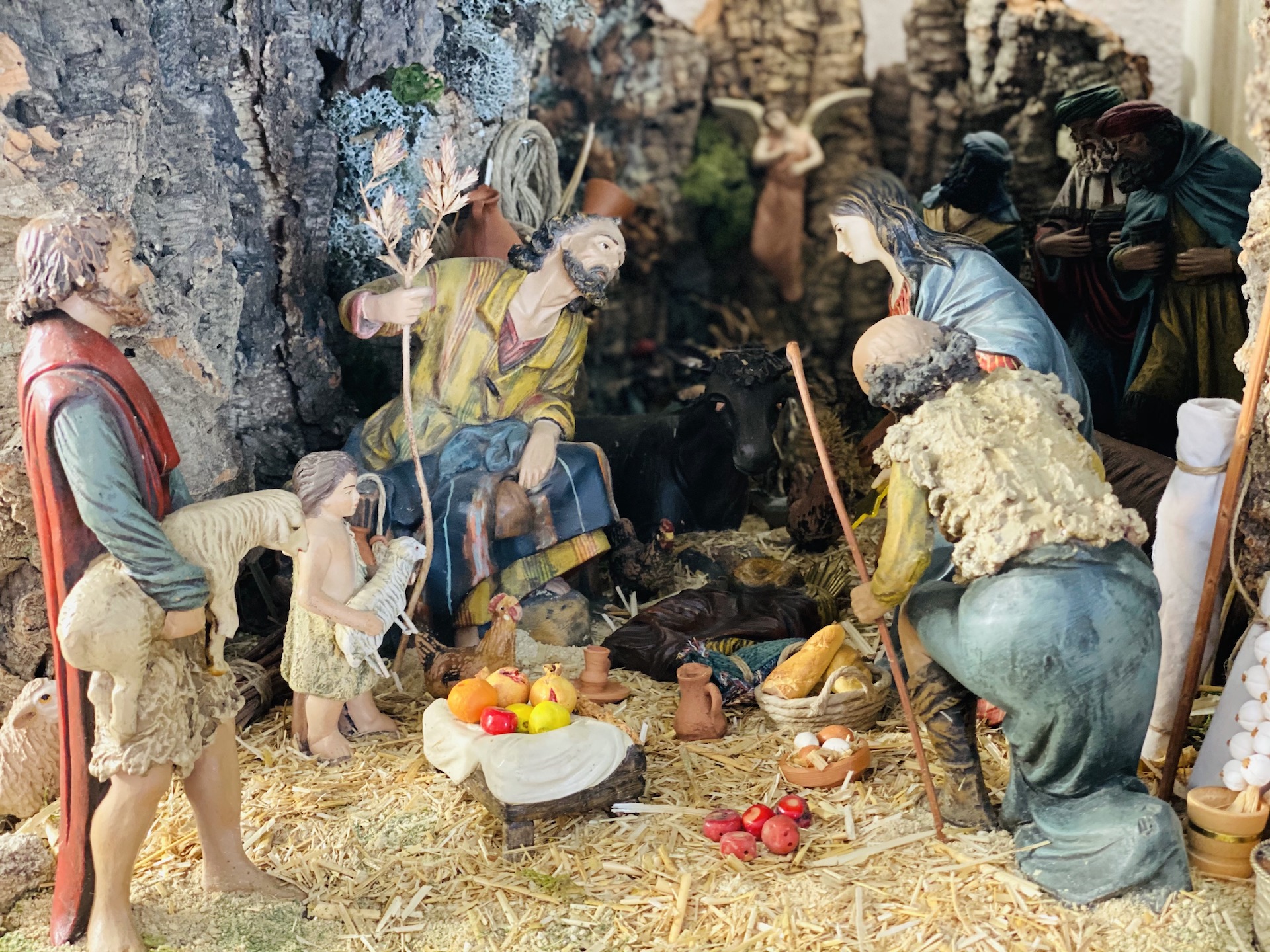Ahora los personajes de escena están como asomados al pretil del escenario, mirando al público en un pasillo de despedida.. los que estaban junto al pozo, los que conversaban por el camino, los que contemplaban el misterio, el niño, el joven, el viejo, la nueva de última hora… todos con sus ovejas, con gallos y gallinas… allí asomados al balcón de la gruta de Belén, contemplando contigo y conmigo la escena que se divisa al fondo…